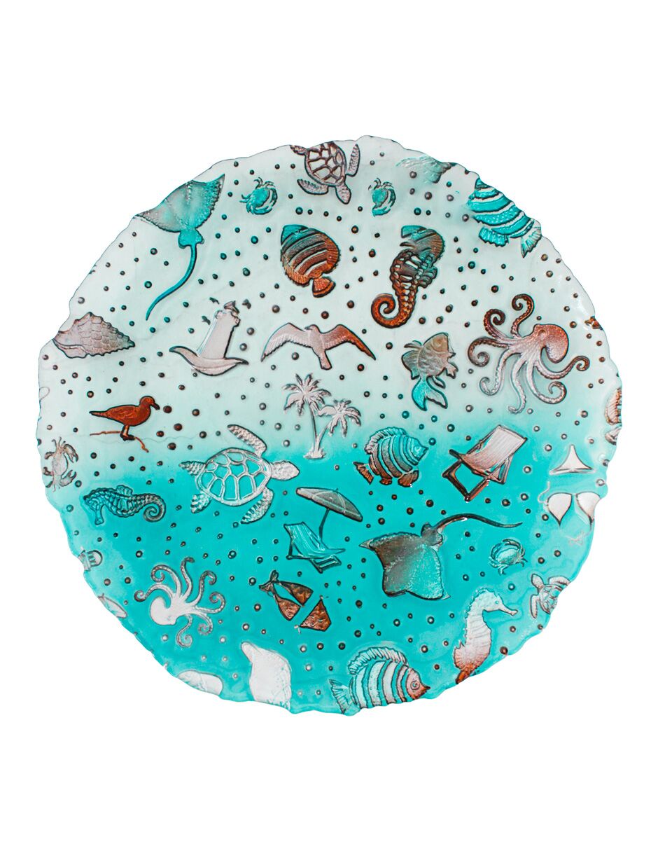 Sumérgete en la vitalidad y el encanto exótico del mar Caribe con este cristalino plato de vidrio turquesa transparente, adornado con un delicado diseño de animales marinos. Su tono vibrante y acuático evoca la alegría de la playa y la frescura tropical, siendo el lienzo ideal para servir mariscos, ensaladas o frutas con un estilo refrescante y temático. Una pieza que inyecta energía y serenidad a tu decoración. Material: Vidrio. Medidas: 28 cm de diámetro.