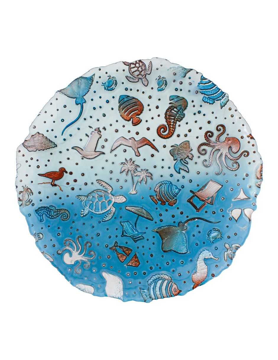 Sumérgete en la frescura y la tranquilidad del océano con este cristalino plato de vidrio azul transparente, adornado con un delicado diseño de animales marinos. Su transparencia y tono acuático evocan la calma de las profundidades, siendo el lienzo ideal para servir mariscos, ensaladas o frutas con un estilo refrescante y temático. Una pieza que inyecta paz y serenidad a tu decoración. Material: Vidrio. Medidas: 28 cm de diámetro.