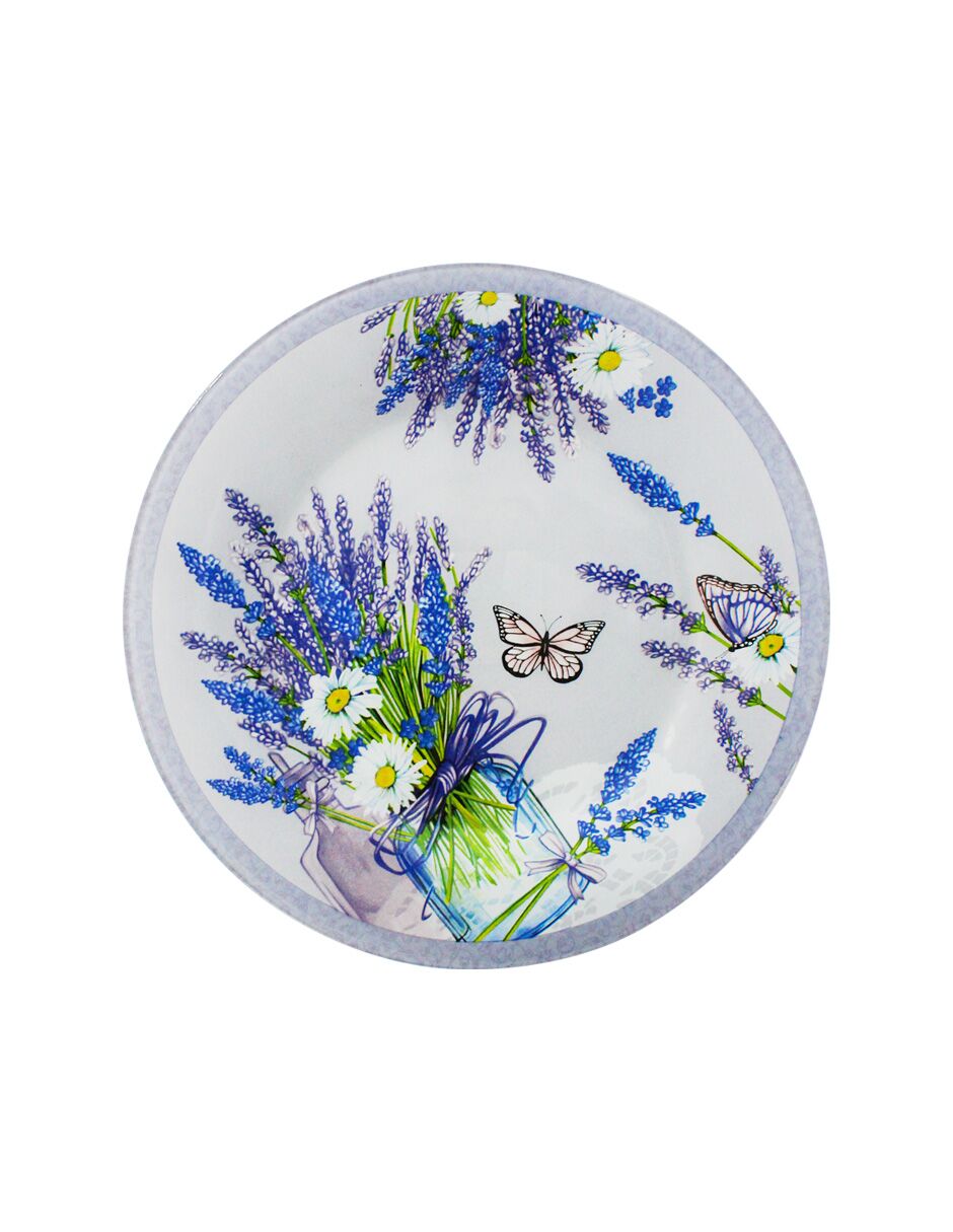 Envuelve tu mesa en la serenidad y el encanto rústico de la Provenza con este delicado plato de vidrio con diseño de lavanda. Su patrón floral y tonalidades suaves aportan un toque de elegancia natural y calma, siendo ideal para servir aperitivos o postres con un estilo sofisticado y campestre. Una pieza que irradia tranquilidad atemporal en cada comida. Material: Vidrio. Medidas: 25 x 25 x 1.6 cm.