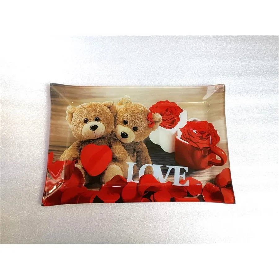 Celebra el amor y la ternura con este adorable plato de vidrio rectangular, adornado con un diseño de osos, flores y la palabra “Love”. Su estilo dulce y romántico lo convierte en el lienzo perfecto para servir aperitivos, postres o como una pieza decorativa que inyecta una sensación de afecto, alegría y calidez. Es el regalo ideal para expresar sentimientos sinceros y decorar con dulzura. Material: Vidrio. Medidas: 35 x 25 x 2.8 cm.