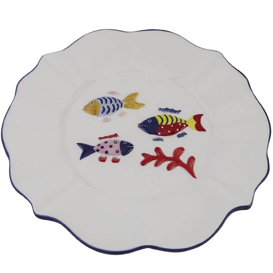 El Plato Peces Orilla Azul es la pieza maestra para quien busca una estética alegre y relajada, combinando la pureza de la loza blanca con un diseño artístico de inspiración oceánica, logrando una presencia visual encantadora en tu espacio de convivencia. Este objeto ofrece una sofisticación náutica incomparable, funcionando como un lienzo de color que aporta la frescura del mar a cada servicio en tu hogar. Su sola presencia ayuda a elevar el optimismo y la luminosidad de tu ambientación de manera inmediata. Lo logra mediante su diseño detallado que presenta tres peces de colores vibrantes (amarillo, rojo y rosa) nadando cerca de una rama de coral rojo, todo enmarcado por una orilla ondulada con un delicado perfil azul, lo que evoca la brisa marina en la categoría de Liquidación.