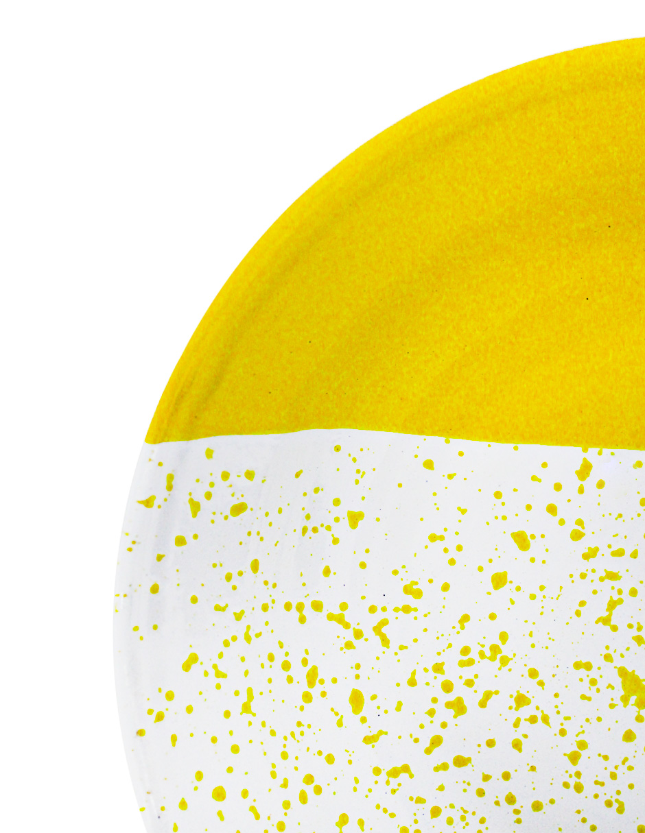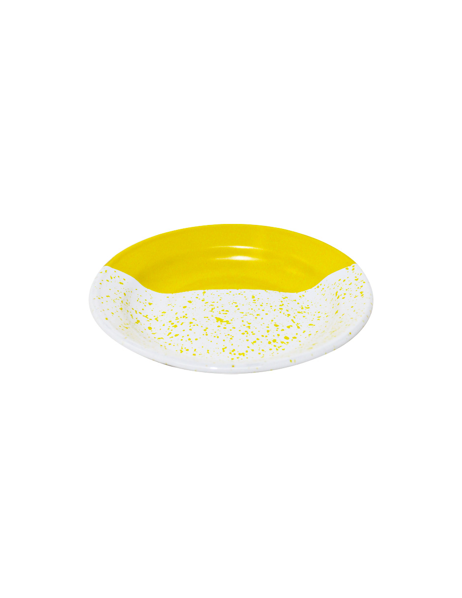 Sirve tu sopa con un toque moderno y alegre. Este plato sopero de peltre amarillo con blanco y puntos es perfecto para tu mesa. Su diseño te hará sentir la alegría y la diversión. Mide 24x24x3cm.