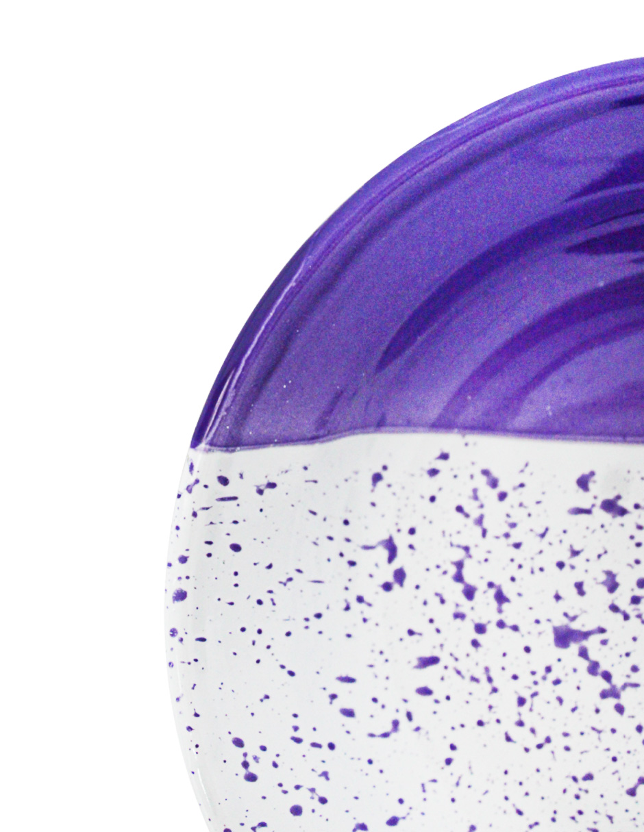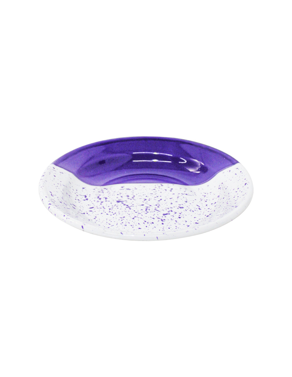 Sirve tu sopa con un toque moderno y alegre. Este plato sopero de peltre morado con blanco y puntos es perfecto para tu mesa. Su diseño te hará sentir la alegría y la diversión. Mide 24x24x3cm.