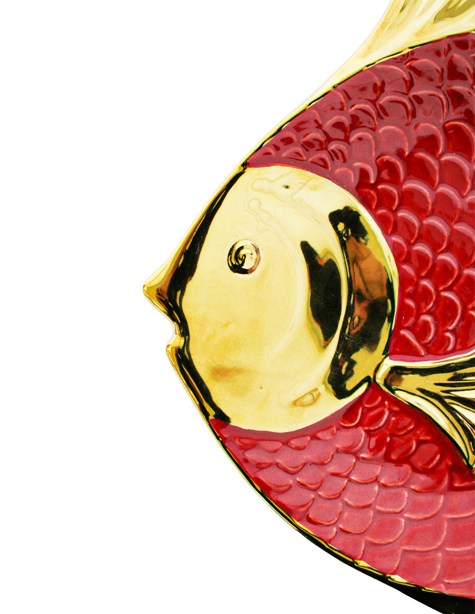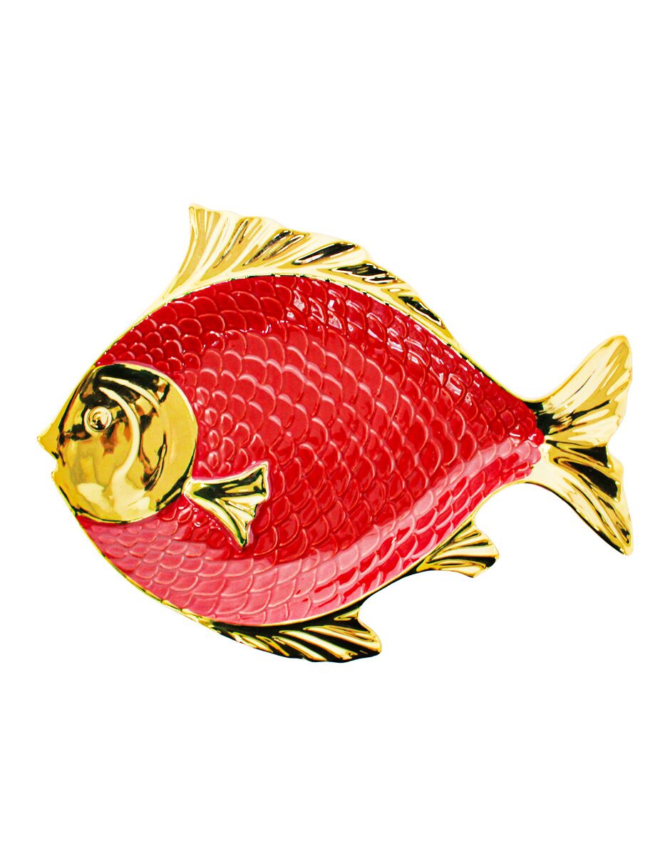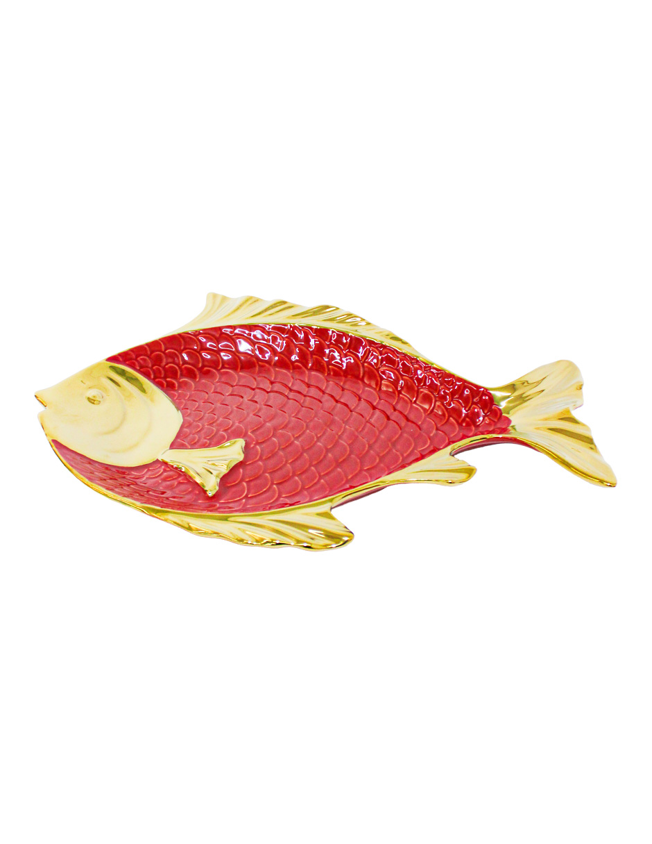 Sirve con un toque de elegancia. Este platón de porcelana con diseño de pescado rojo con dorado es perfecto para presentar tus alimentos, añadiendo un acento sofisticado y original. Su diseño te hará sentir la distinción y el refinamiento. Mide 44×34.8×4.8cm.