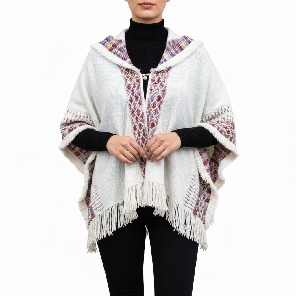 El Poncho Blanco con Capucha y Patrón invoca la Pureza Luminosa. Por lo tanto, garantiza la Elegancia Serana. Este es un objeto de profunda funcionalidad. Además, posee un diseño inigualable. Fue diseñado para infundir paz y distinción a tu atuendo. Así mismo, te brinda una calidez reconfortante. El color Blanco es símbolo de claridad y nuevos comienzos. De hecho, el patrón tejido aporta un toque de estatus orgánico y artístico. Todo esto lo convierte en una pieza esencial para el invierno. Despierta la quietud interior al saber que tu estilo es radiante. Finalmente, esto promueve la calma y el enfoque reflexivo en la solidez de tu presencia.