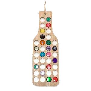 Novedoso porta fichas (corcholatas) de colección con un original diseño de botella. Fabricado en madera natural con ranuras precisas para insertar y exhibir las corcholatas de tus bebidas favoritas. Ideal para coleccionistas. El material es madera. Medidas: 16.5 x 48 x 0.9 cm.