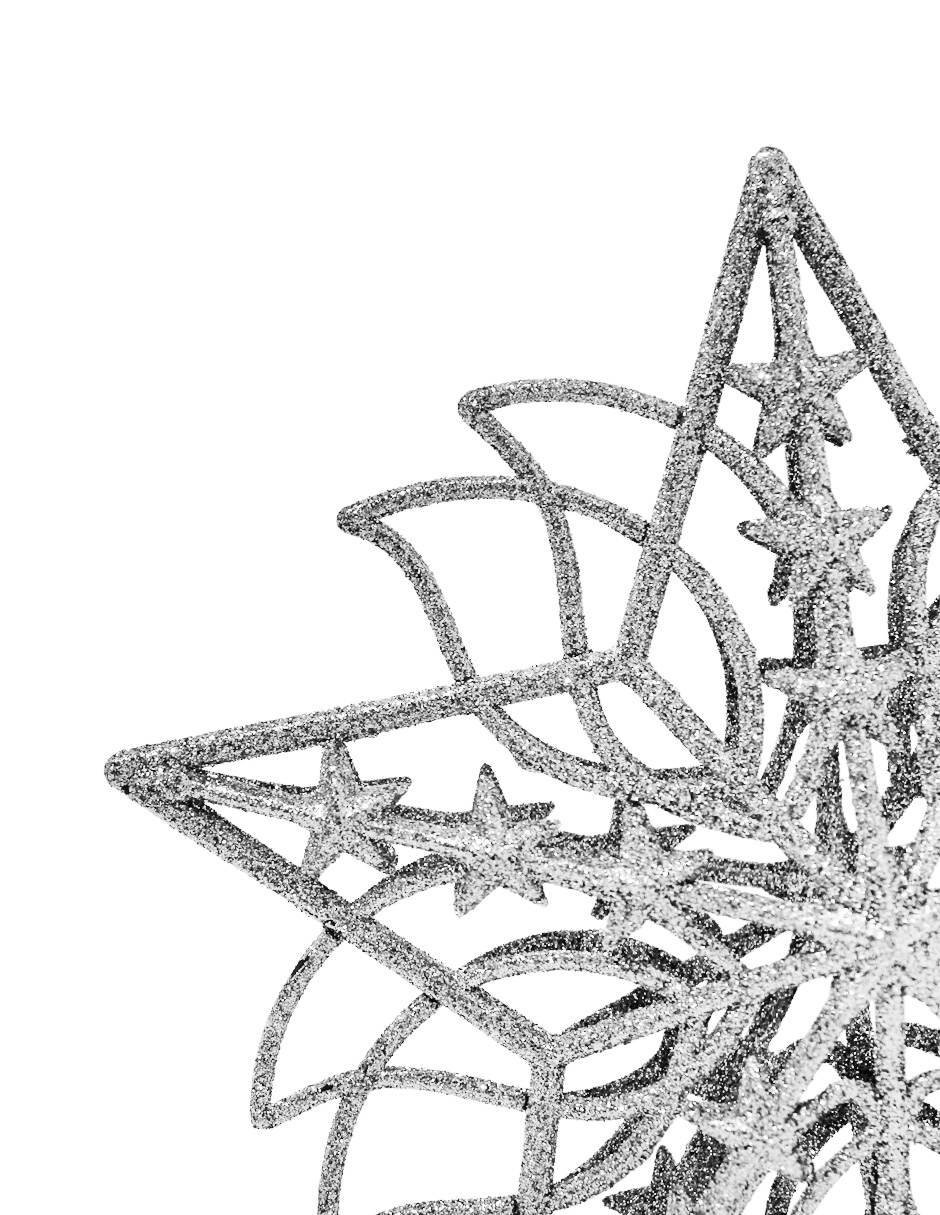 Punta de árbol en forma de estrella en color plateado con acabado diamantado. Es el toque final perfecto para tu árbol, aportando un brillo deslumbrante. Mide 19.5cm.