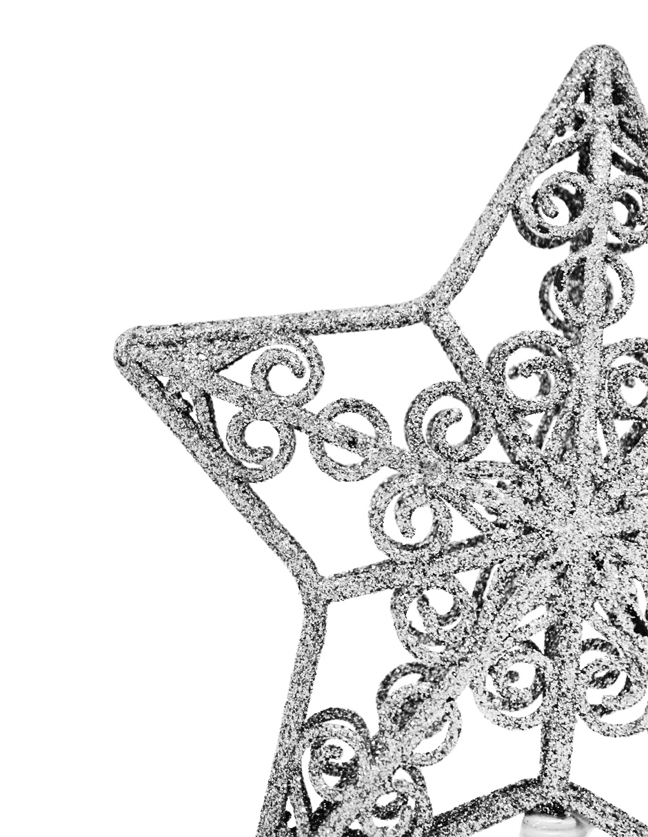 Punta para árbol con forma de estrella y acabado de diamantina plateada. Un accesorio esencial para coronar tu árbol con elegancia y brillo.