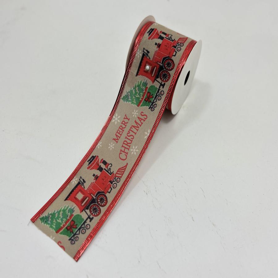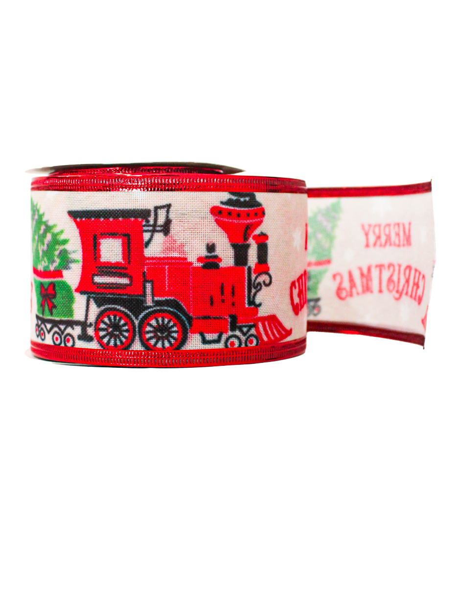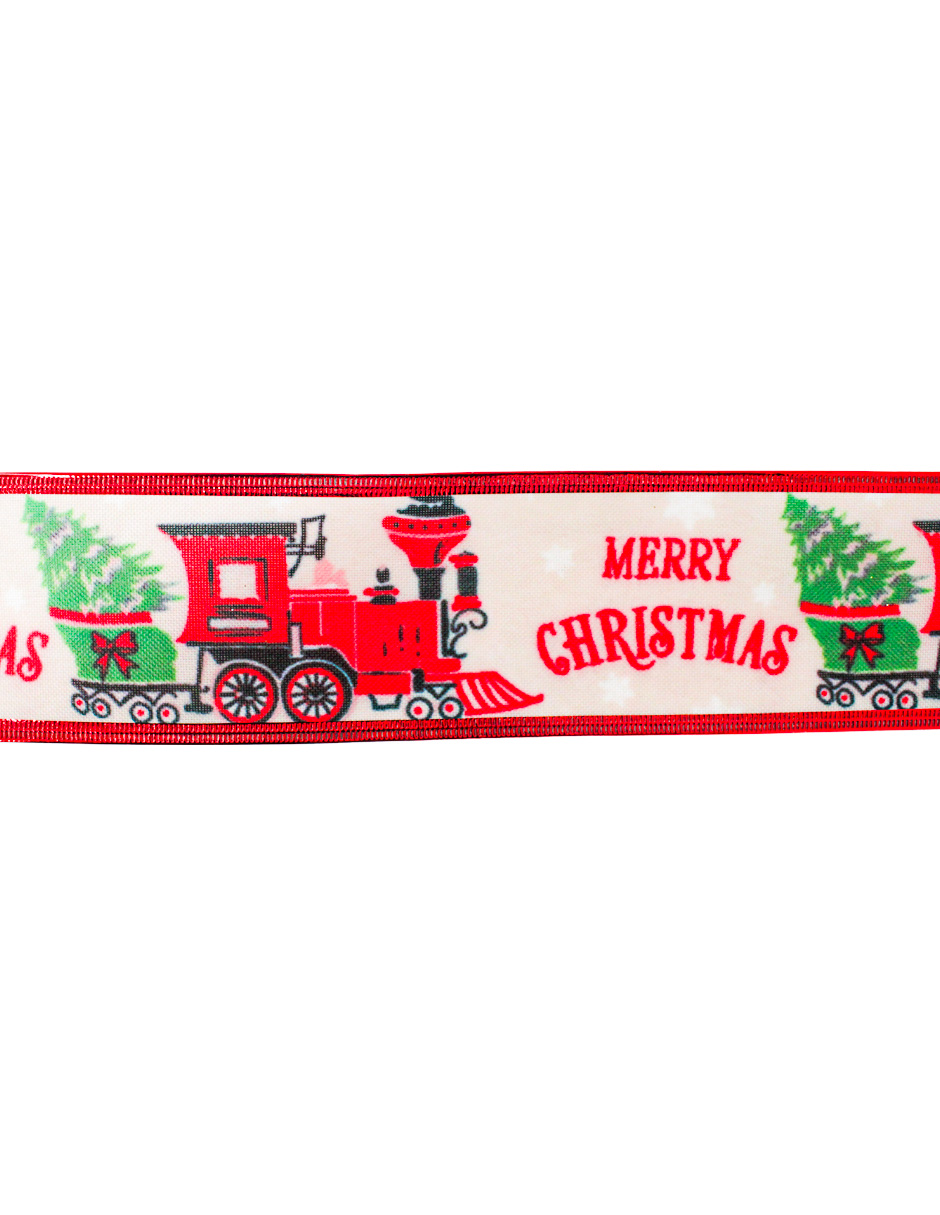Rollo de listón en color blanco con un clásico estampado de tren y pino navideño. Es perfecto para añadir un toque tradicional y nostálgico a tus decoraciones.