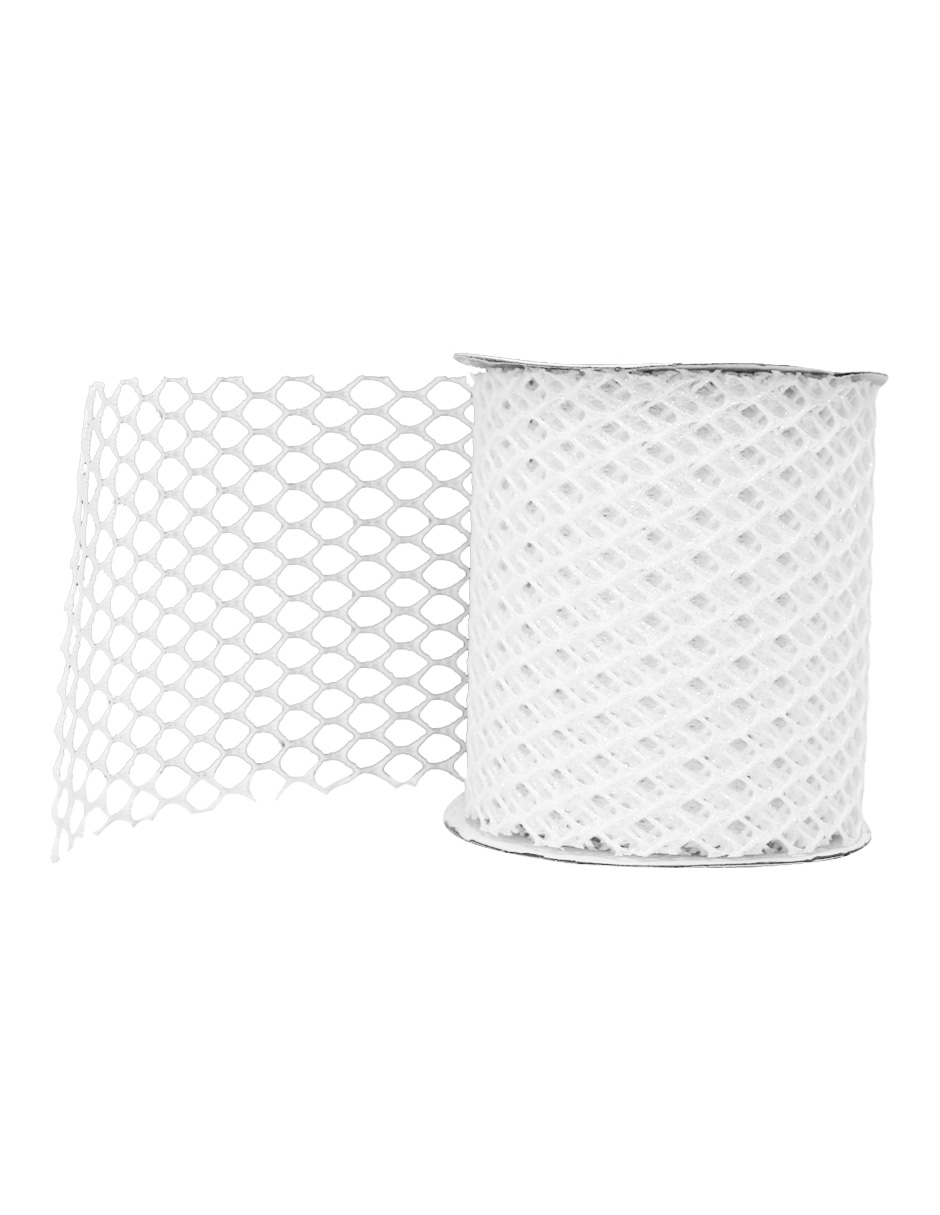Rollo de listón con un delicado diseño calado en color blanco. Es perfecto para añadir un toque de elegancia y sofisticación a tus decoraciones y regalos.