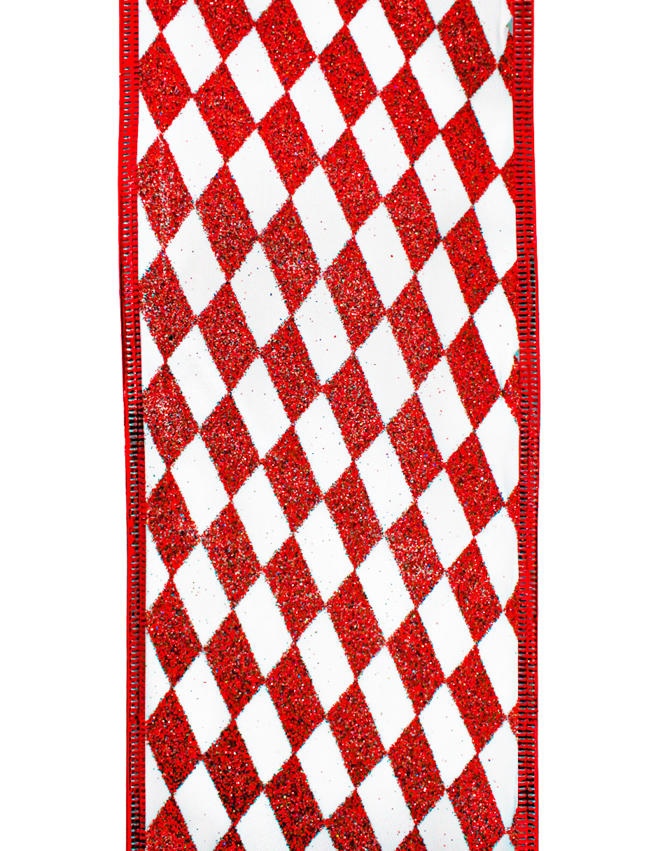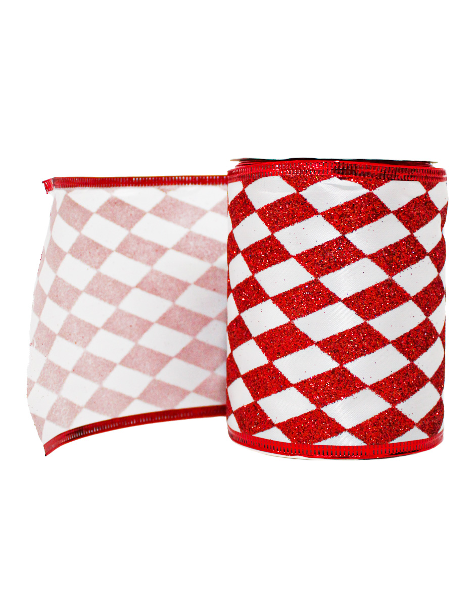 Rollo de listón con un clásico estampado de rombos en rojo y blanco. Es perfecto para añadir un toque tradicional y festivo a tus decoraciones y regalos.
