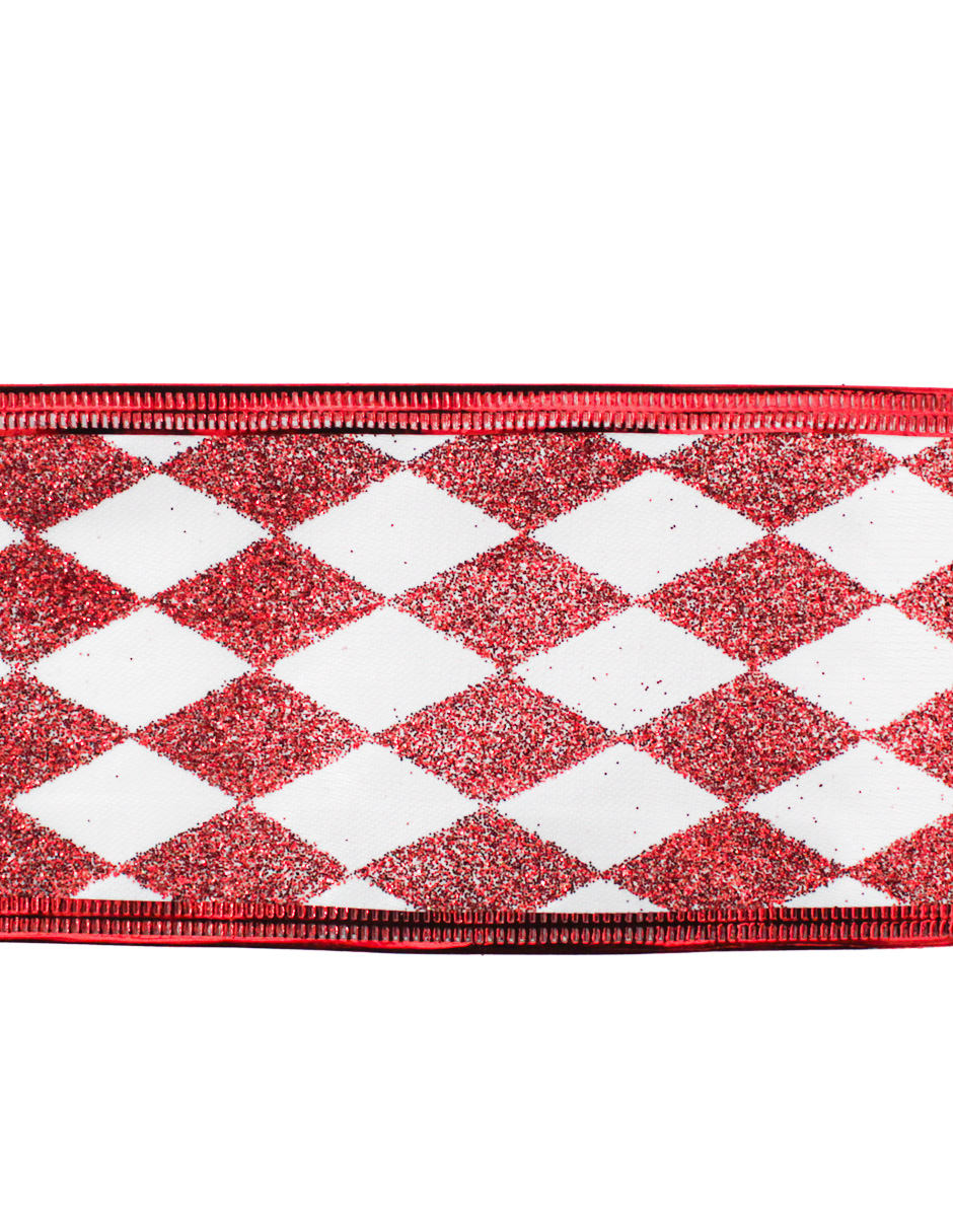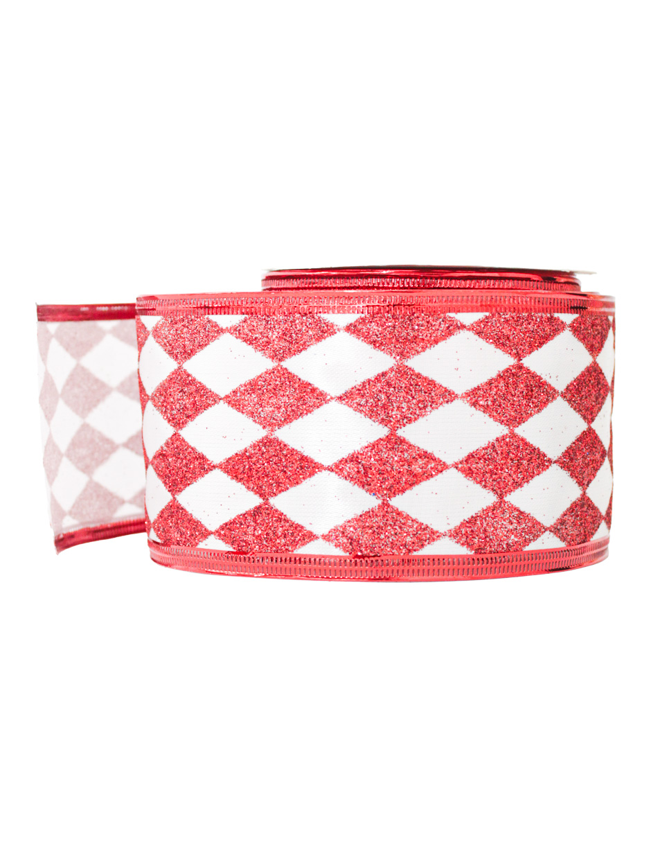Rollo de listón con un clásico estampado de rombos en rojo y blanco. Es perfecto para añadir un toque tradicional y festivo a tus decoraciones y regalos.