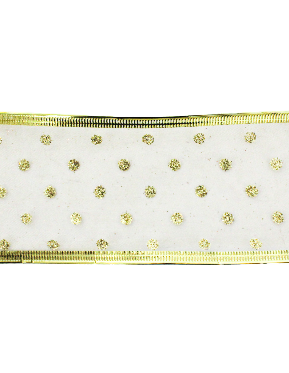 Rollo de listón de gasa con elegantes lunares dorados. Es perfecto para añadir un toque de brillo y sofisticación a tus decoraciones y regalos.