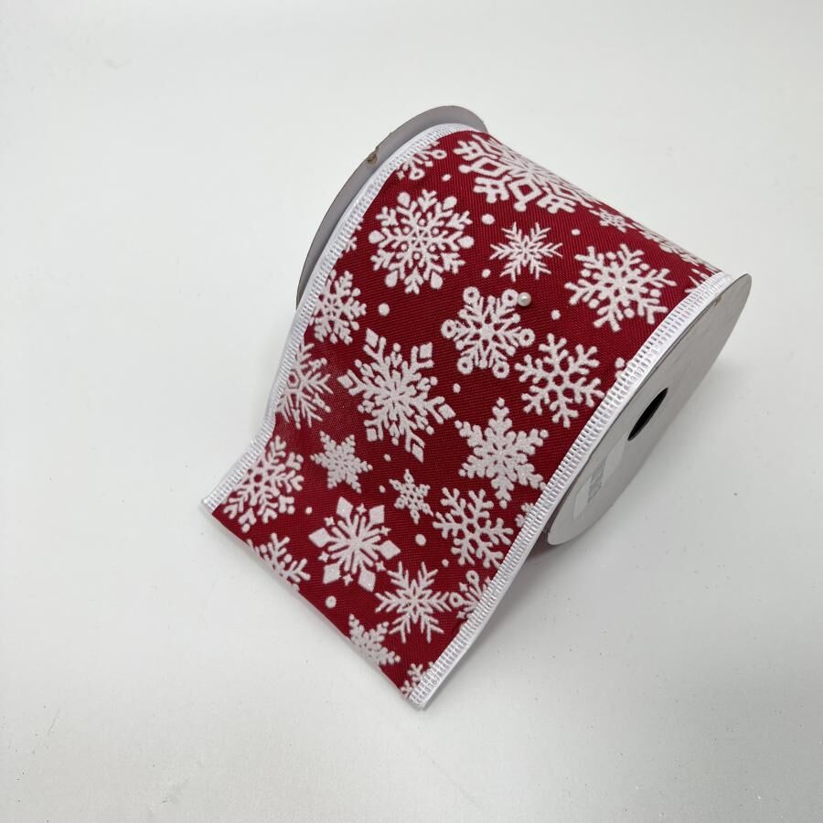 Rollo de listón rojo con un festivo patrón de copos de nieve blancos. Ideal para decorar regalos, coronas o cualquier manualidad. Material: poliéster. Medidas: 10cm x 10m.