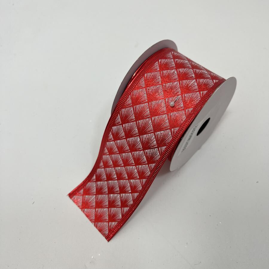 Rollo de listón rojo con un sutil patrón de rombos blancos. Ideal para decorar regalos, coronas o cualquier manualidad. Material: poliéster. Medidas: 6.35cm x 10m.