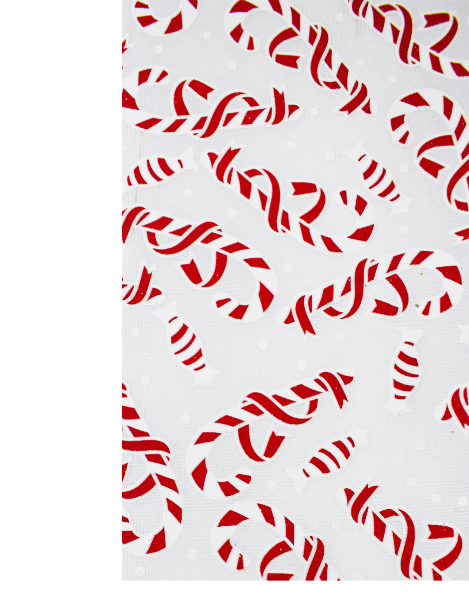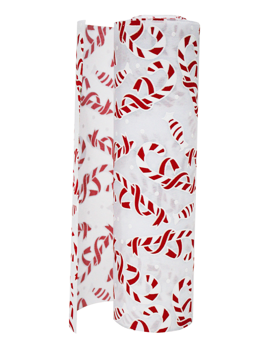 Rollo de tela color blanco con un dulce estampado de bastones de caramelo. Material ideal para proyectos temáticos y lúdicos. El rollo mide 30 cm x 10 m.