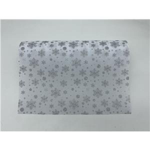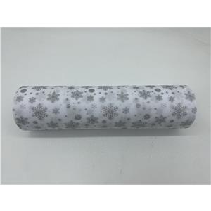 Rollo de tela en color blanco con un delicado estampado de copos de nieve. Ideal para un estilo invernal, minimalista y luminoso. El material es tela.