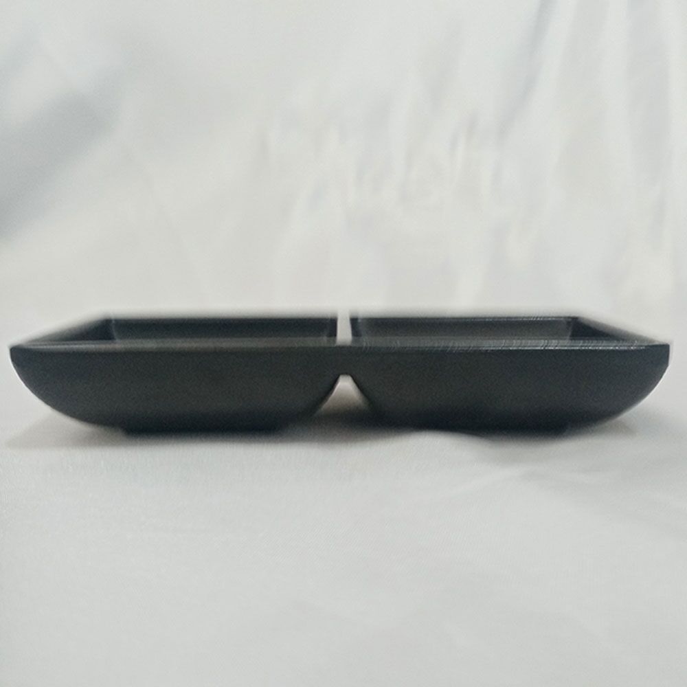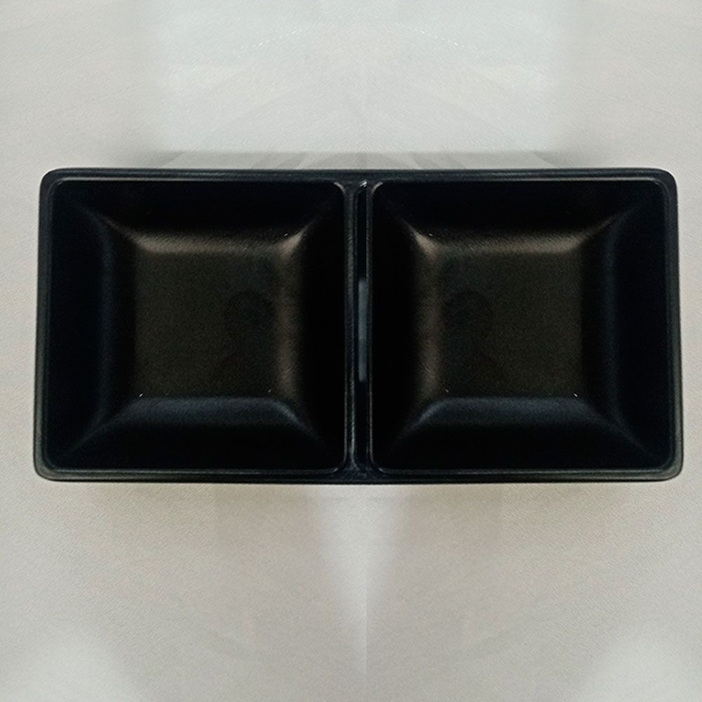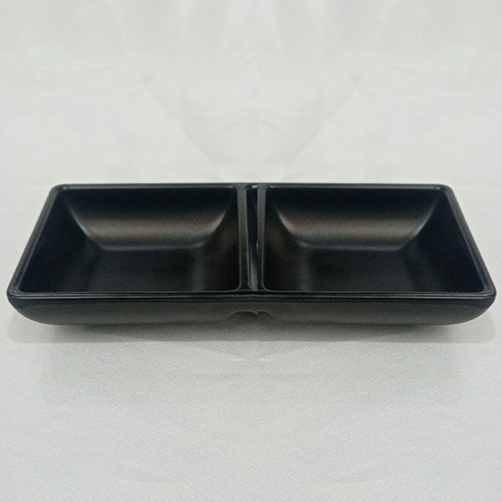Salsera doble con acabado negro mate. El diseño dividido es perfecto para salsas y la melamina le da resistencia y ligereza. El material es melamina. Medidas: 15 x 7.5 cm.