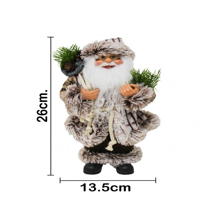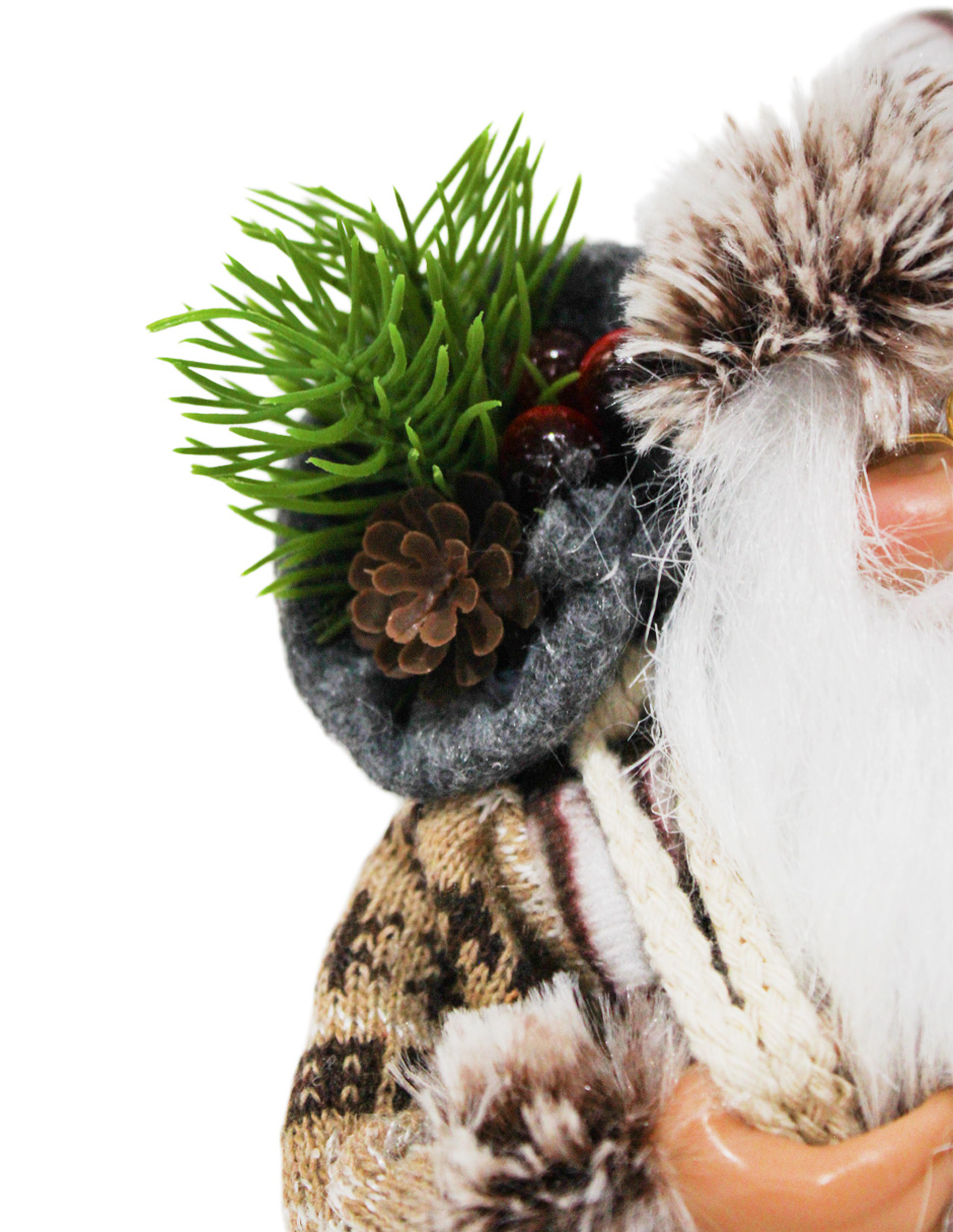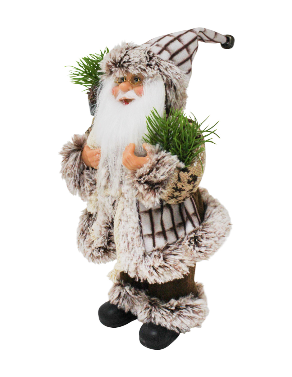 Figura decorativa de Santa Claus con un abrigo blanco a cuadros rojos y follaje. Es la pieza ideal para añadir un toque de encanto y calidez a tus espacios. Material: resina y tela. Medidas: 25cm.