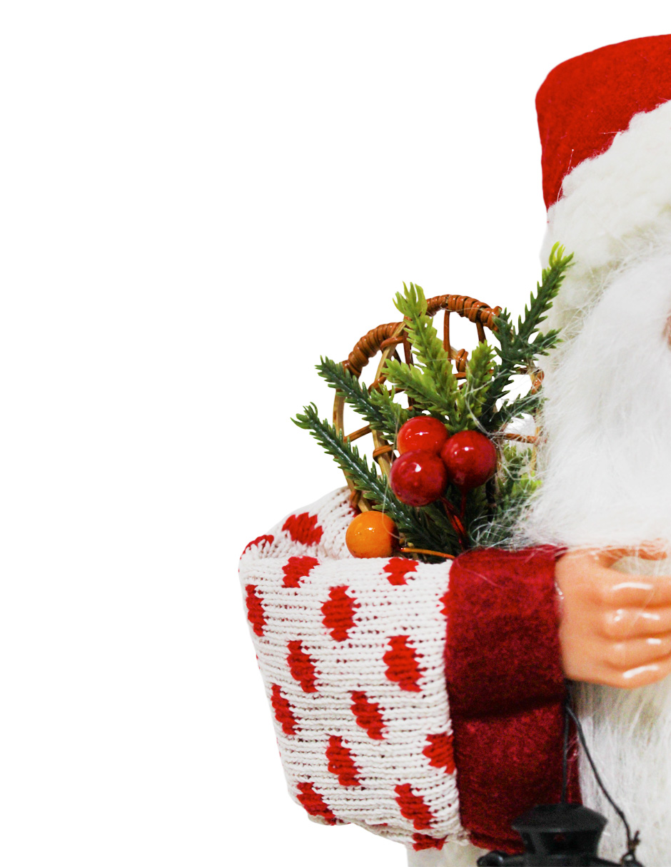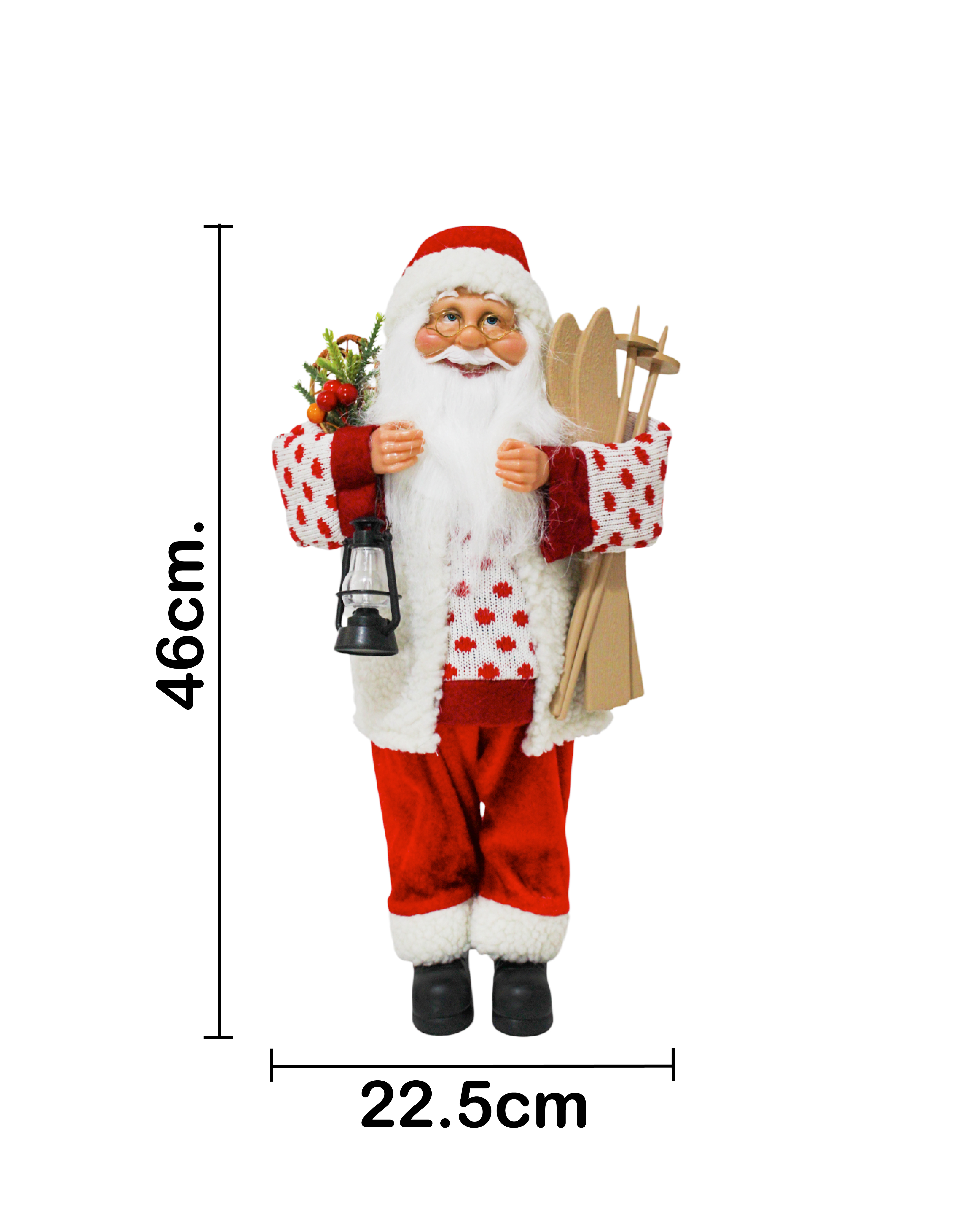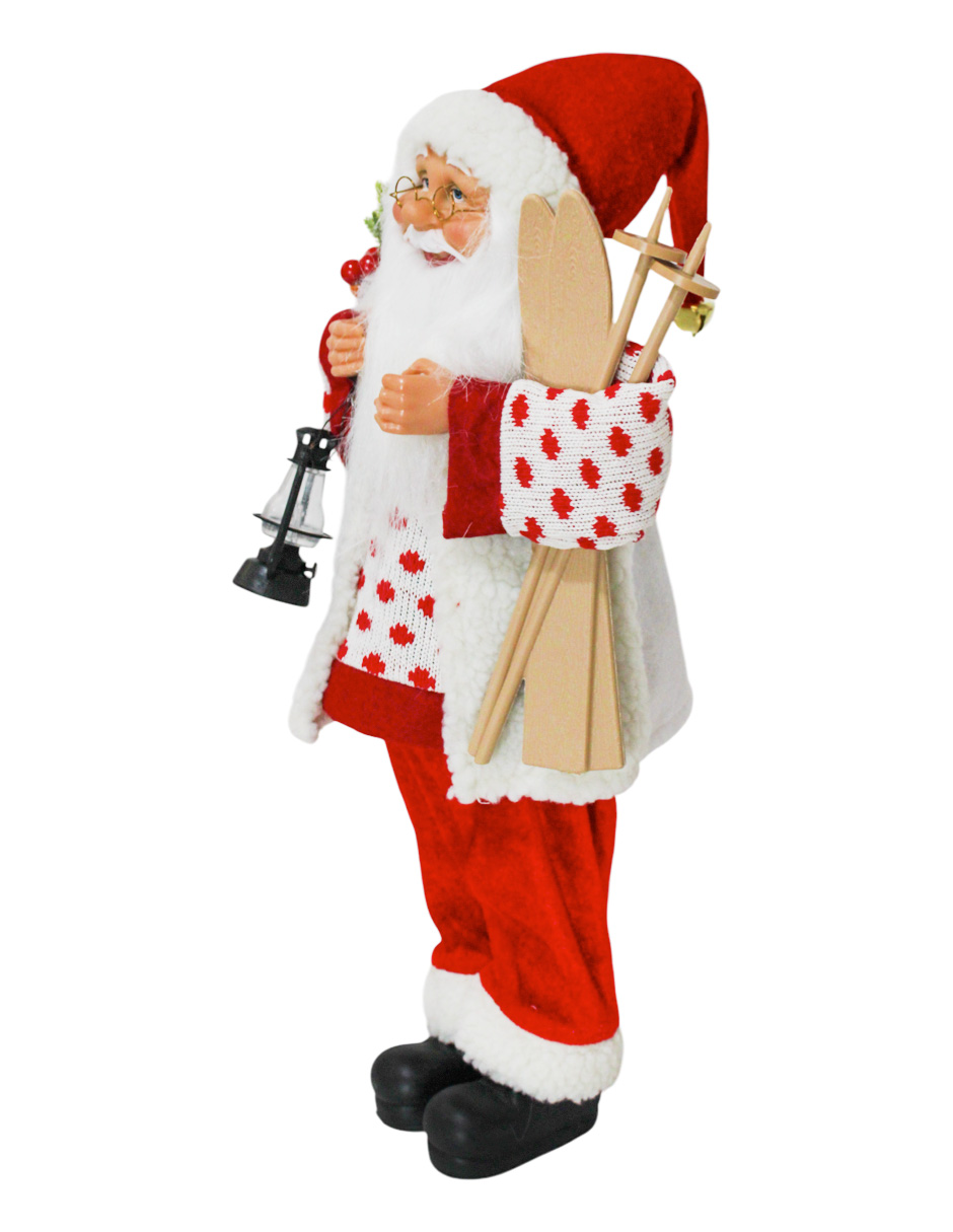 Figura decorativa de Santa Claus con un abrigo blanco con puntos rojos, una linterna y esquís. Es la pieza ideal para añadir un toque de encanto y calidez. Material: resina y tela. Medidas: 45cm.