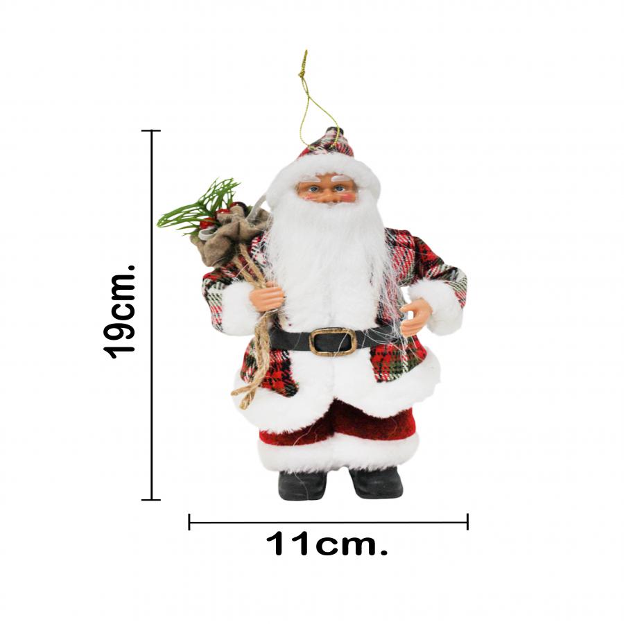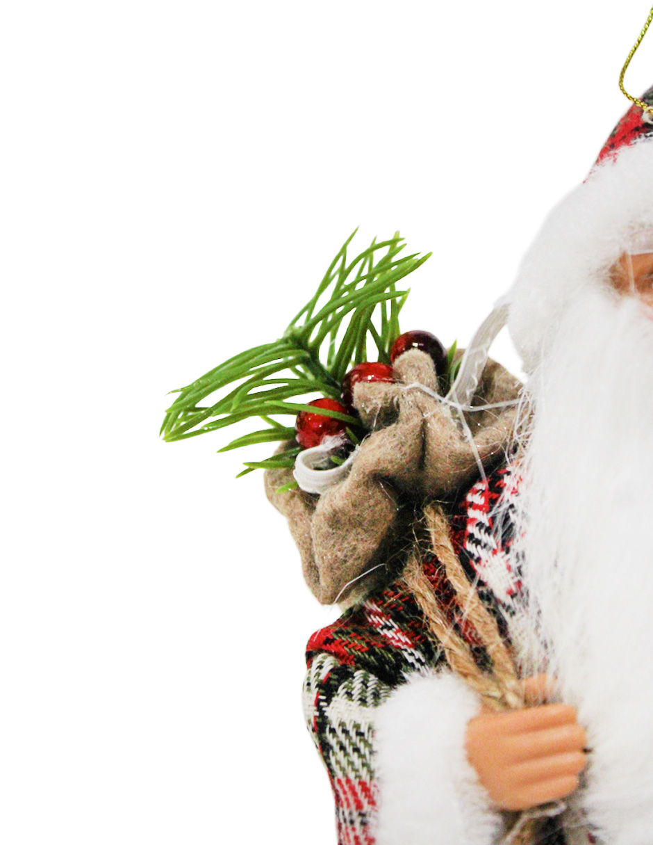 Figura decorativa de Santa Claus con un elegante abrigo escocés y follaje. Es la pieza ideal para añadir un toque de encanto y estilo a tus espacios. Material: resina y tela. Medidas: 20cm.