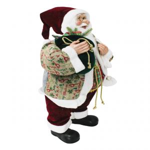 Figura decorativa de Santa Claus con un elegante traje en colores beige y vino, con un costal y la lista de los regalos. Es la pieza ideal para añadir un toque de encanto y calidez. Material: poliresina. Medidas: 42x28x110cm.
