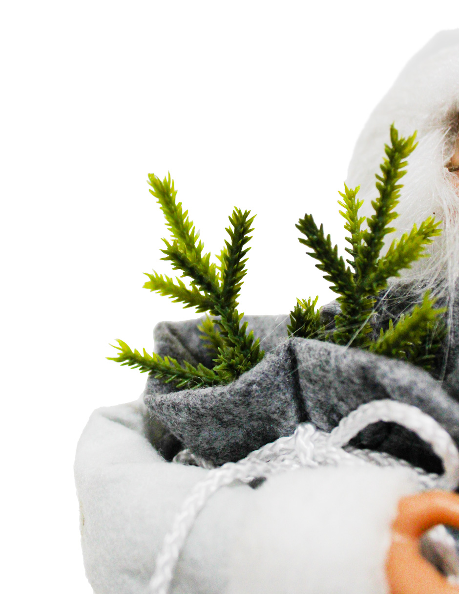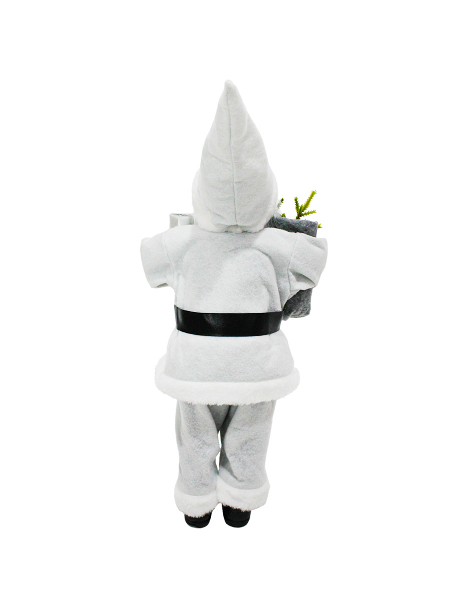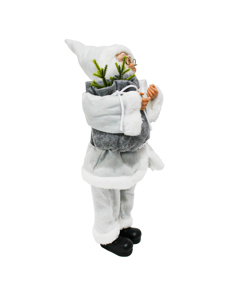 Figura decorativa de Santa Claus con un elegante traje blanco, una bolsa y follaje. Es la pieza ideal para añadir un toque de encanto y calidez a tus espacios. Material: poliresina y tela. Medidas: 30cm.