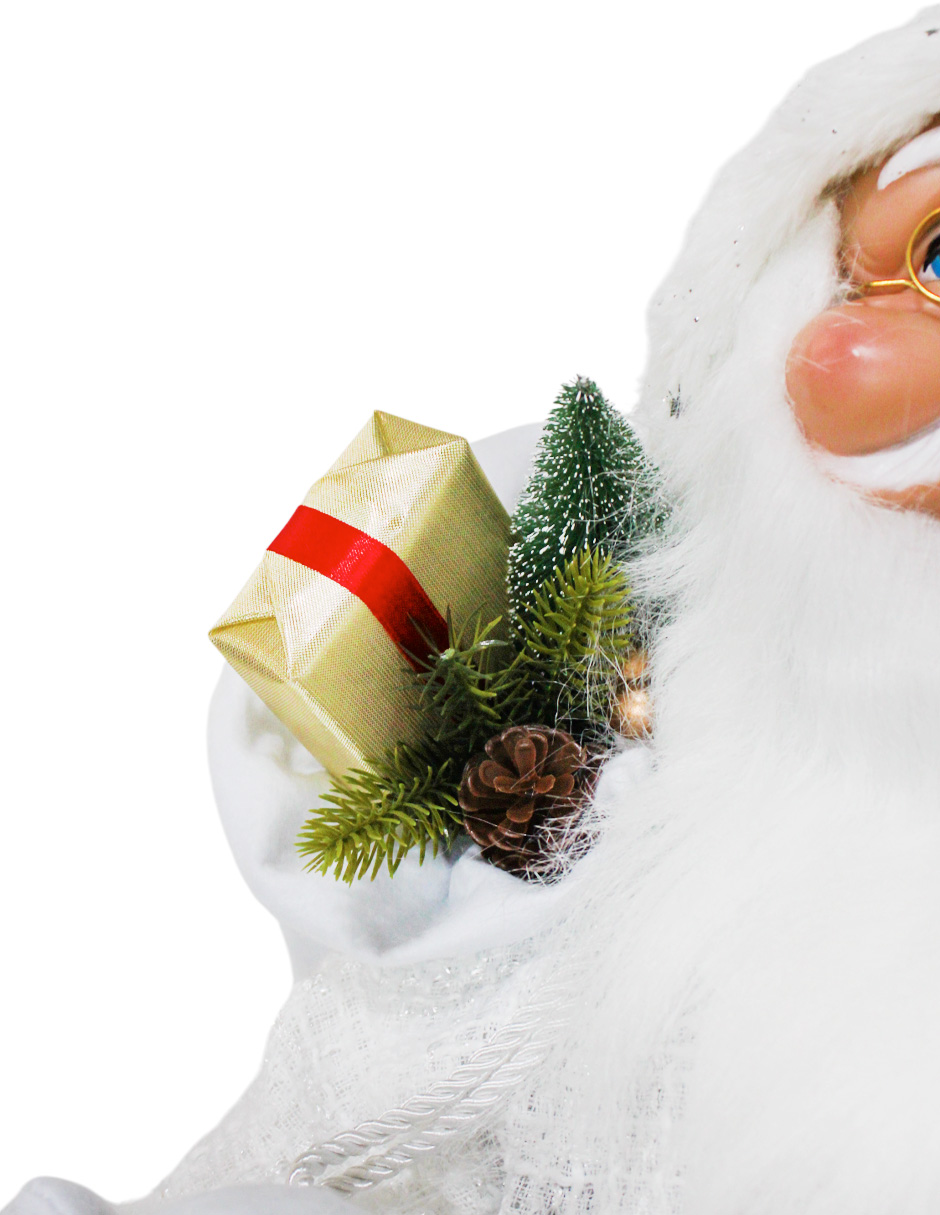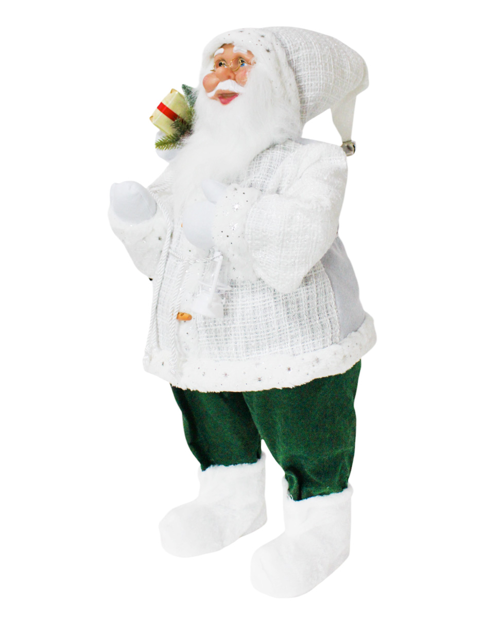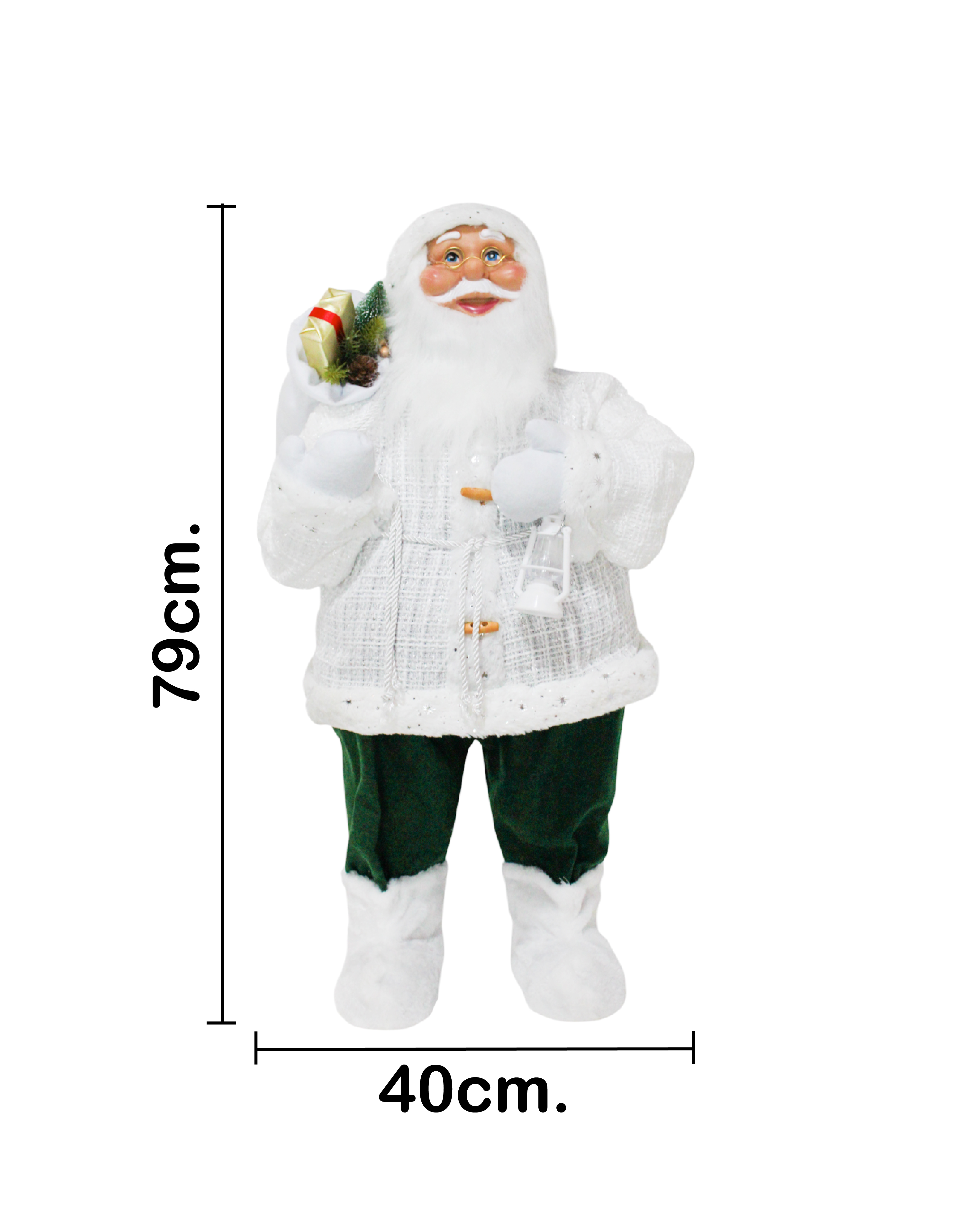 Figura decorativa de Santa Claus con un elegante traje en colores blanco y verde, con un costal y una linterna. Es la pieza ideal para añadir un toque de encanto y calidez. Material: poliresina. Medidas: 35x28x80cm.