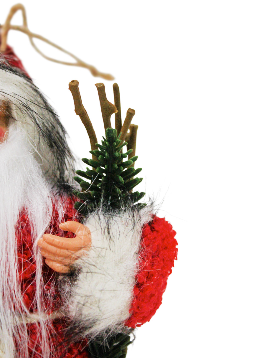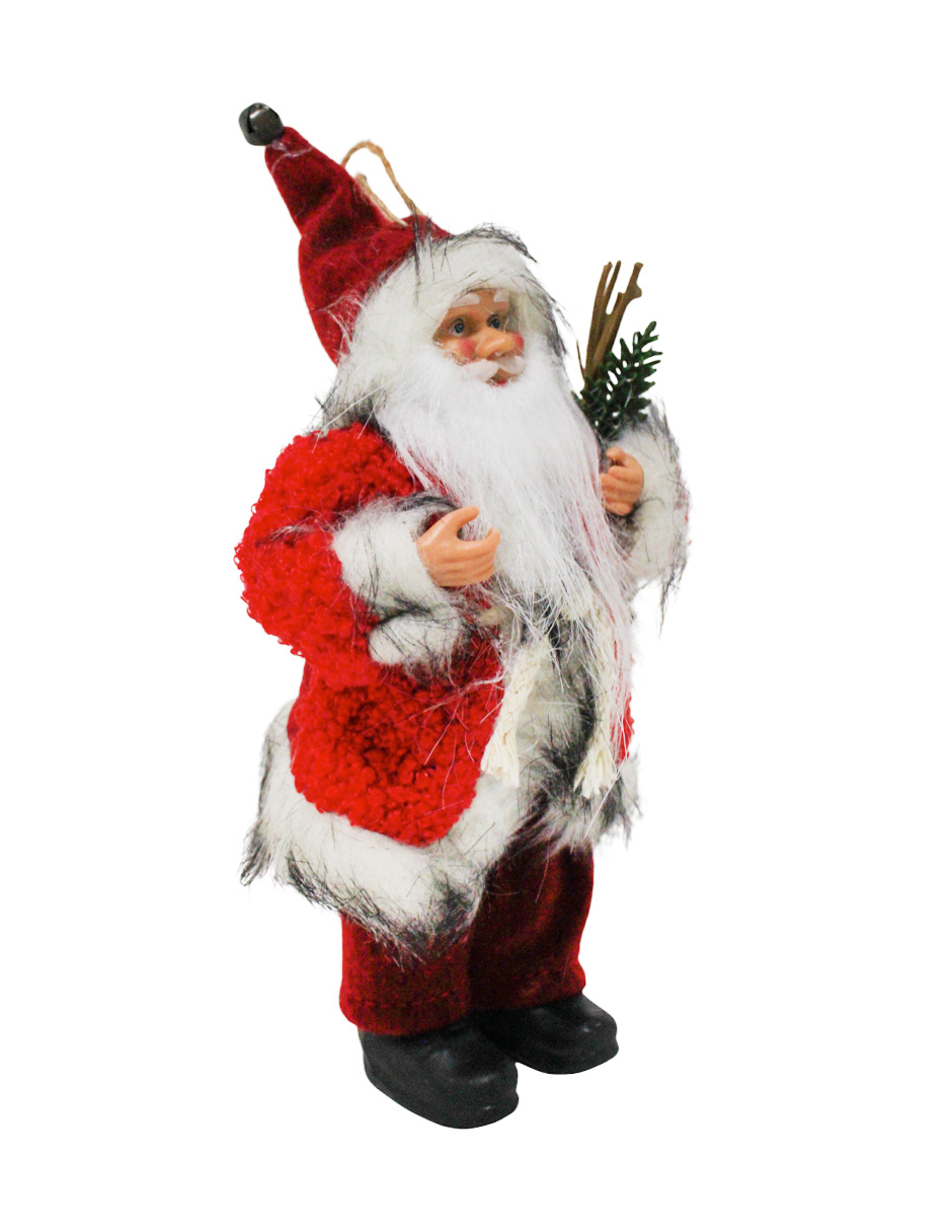 Figura decorativa de Santa Claus con un clásico traje rojo y un pequeño pino de Navidad. Es la pieza ideal para añadir un toque de alegría y encanto. Material: resina y tela. Medidas: 20cm.