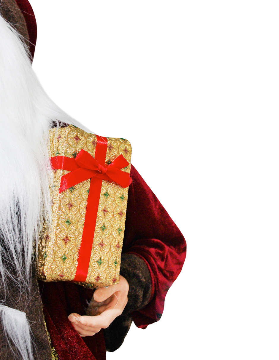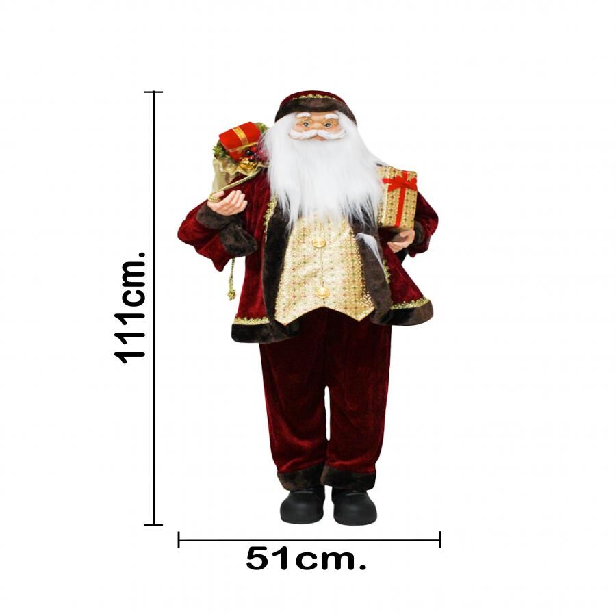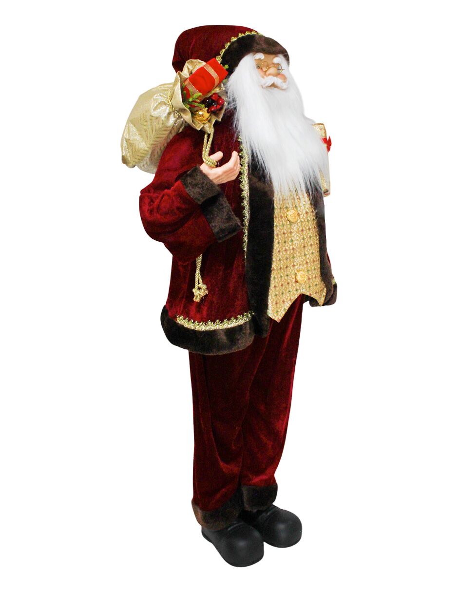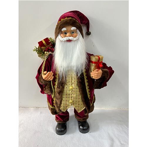 Figura decorativa de Santa Claus con un elegante traje en colores vino y dorado, y una caja de regalos. Es la pieza ideal para añadir un toque de lujo y encanto. Material: poliresina. Medidas: 42x28x110cm.