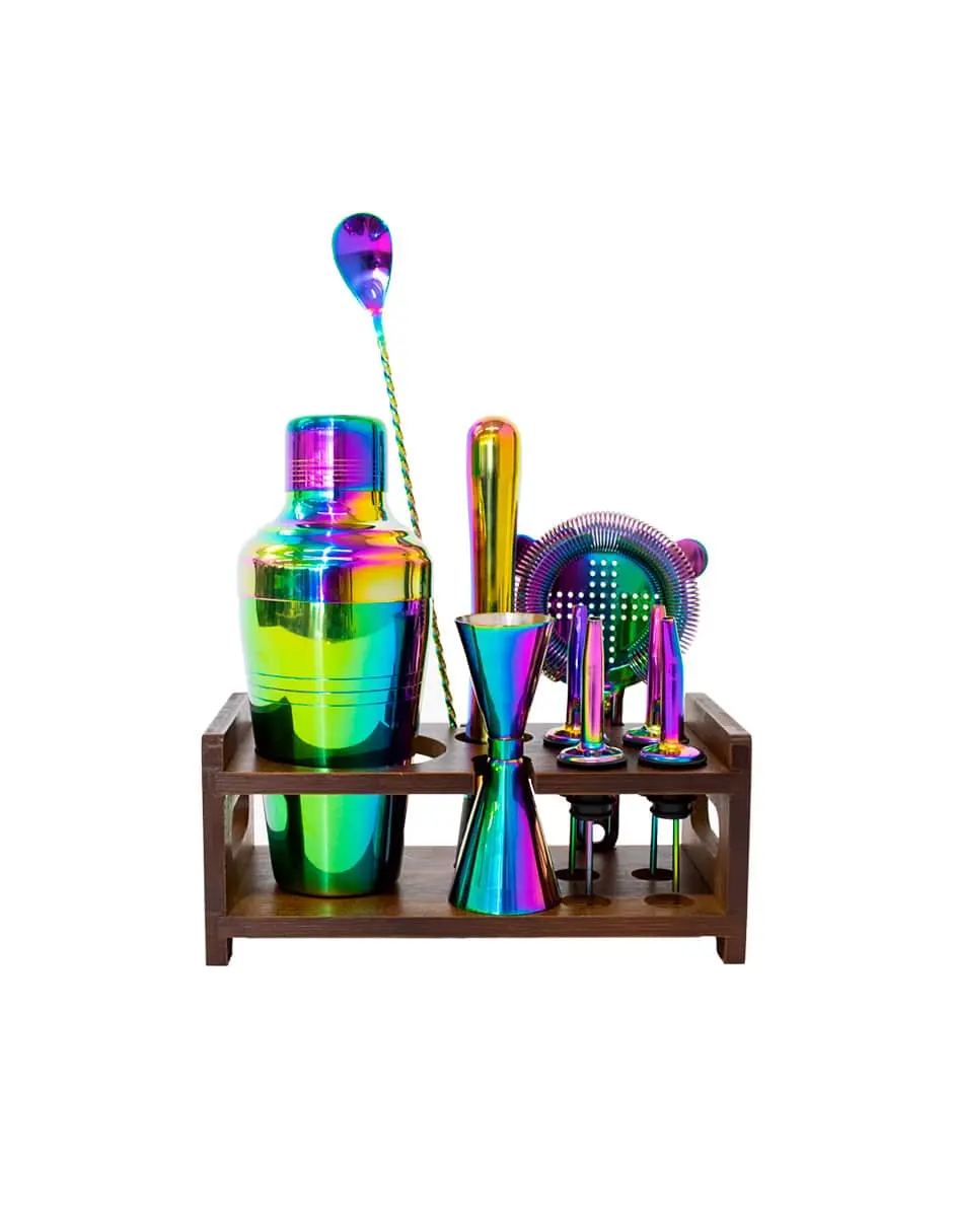 Set completo de coctelería de 10 piezas con acabado multicolor iridiscente que le da un toque vanguardista. Fabricado en acero inoxidable de grado alimenticio, ideal para bartenders profesionales o entusiastas en casa. Incluye jigger, cuchara, colador, etc. Medidas: 11.5 x 30.5 x 19.5 cm.