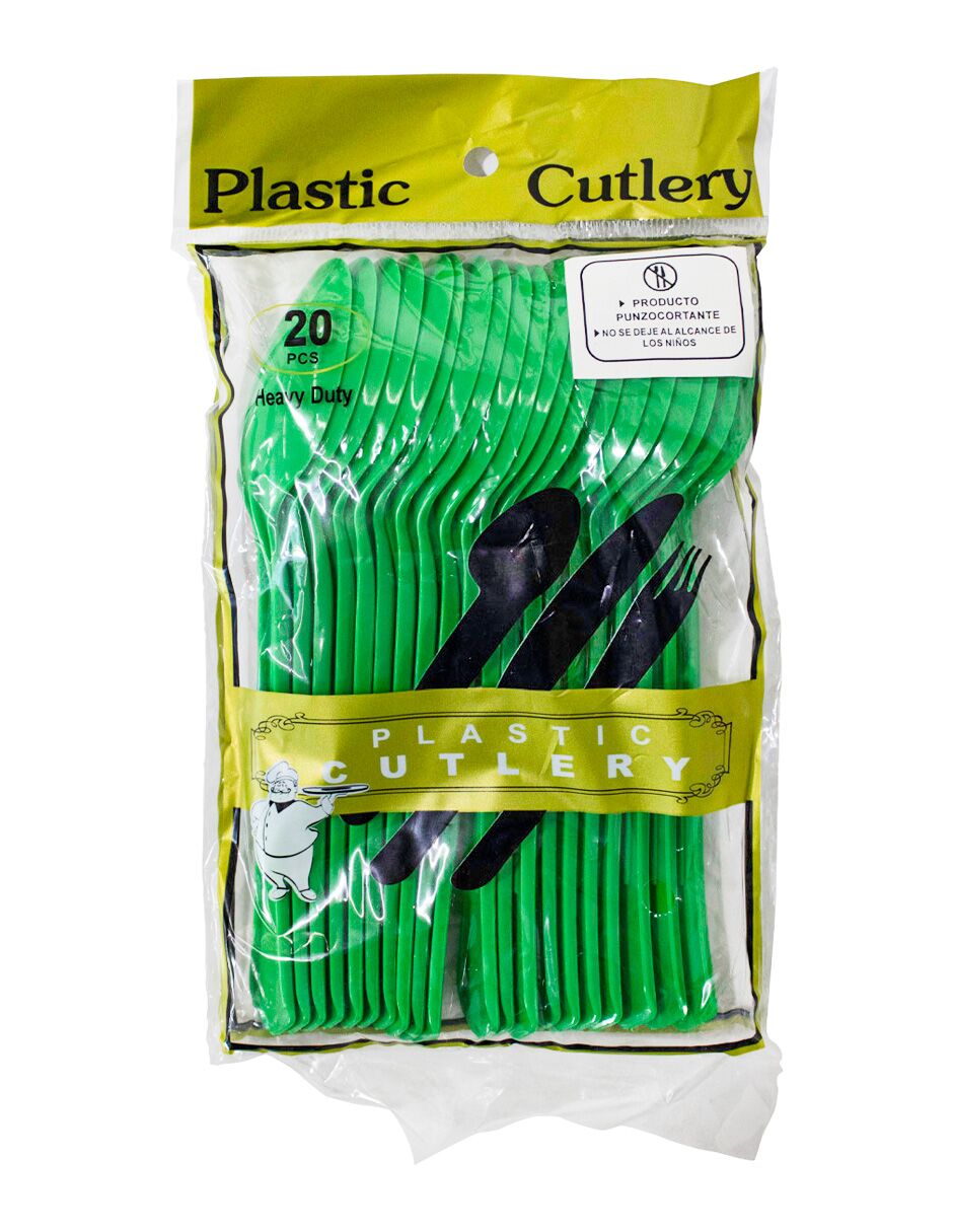 Set de 20 cucharas desechables en color verde. Ideales para fiestas temáticas de jardín, selva o para añadir un toque de frescura a la mesa. El material es plástico. Medidas: 14 cm.