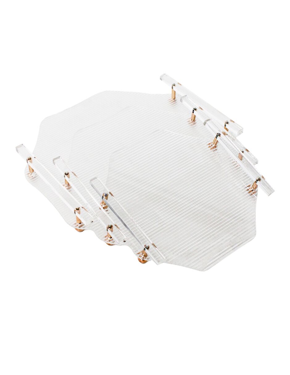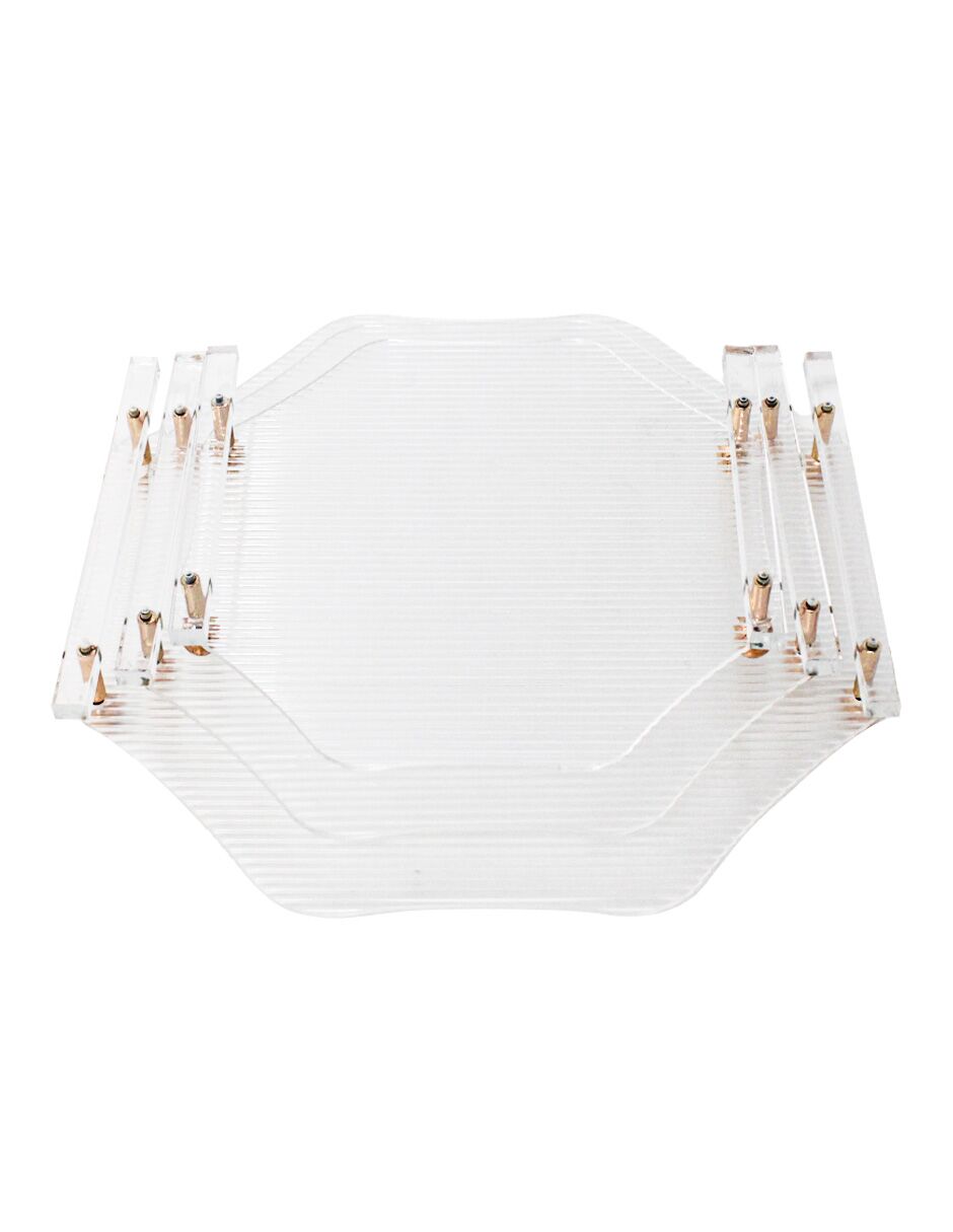 Set de 3 charolas octagonales en tamaños variados, fabricadas en acrílico con un elegante acabado calado (ranurado). Su forma geométrica es muy moderna. El material es acrílico. Medidas (aproximadas): 34 x 34 x 5 cm, 29 x 29 x 5 cm, 24 x 24 x 5 cm.