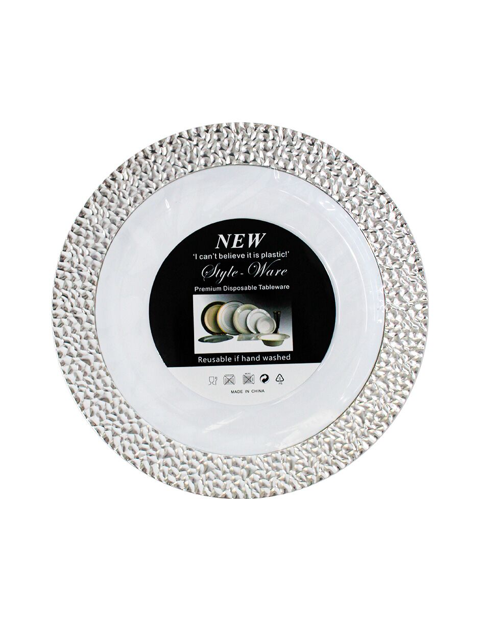 Set de 3 platos de gran formato. Fabricados en plástico premium con un lujoso borde plateado. Ideales como base o para servir grandes porciones. El material es plástico. Medidas: 25.4 cm de diámetro.