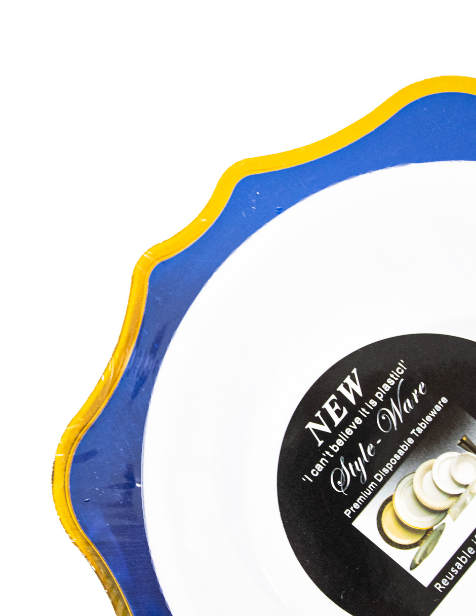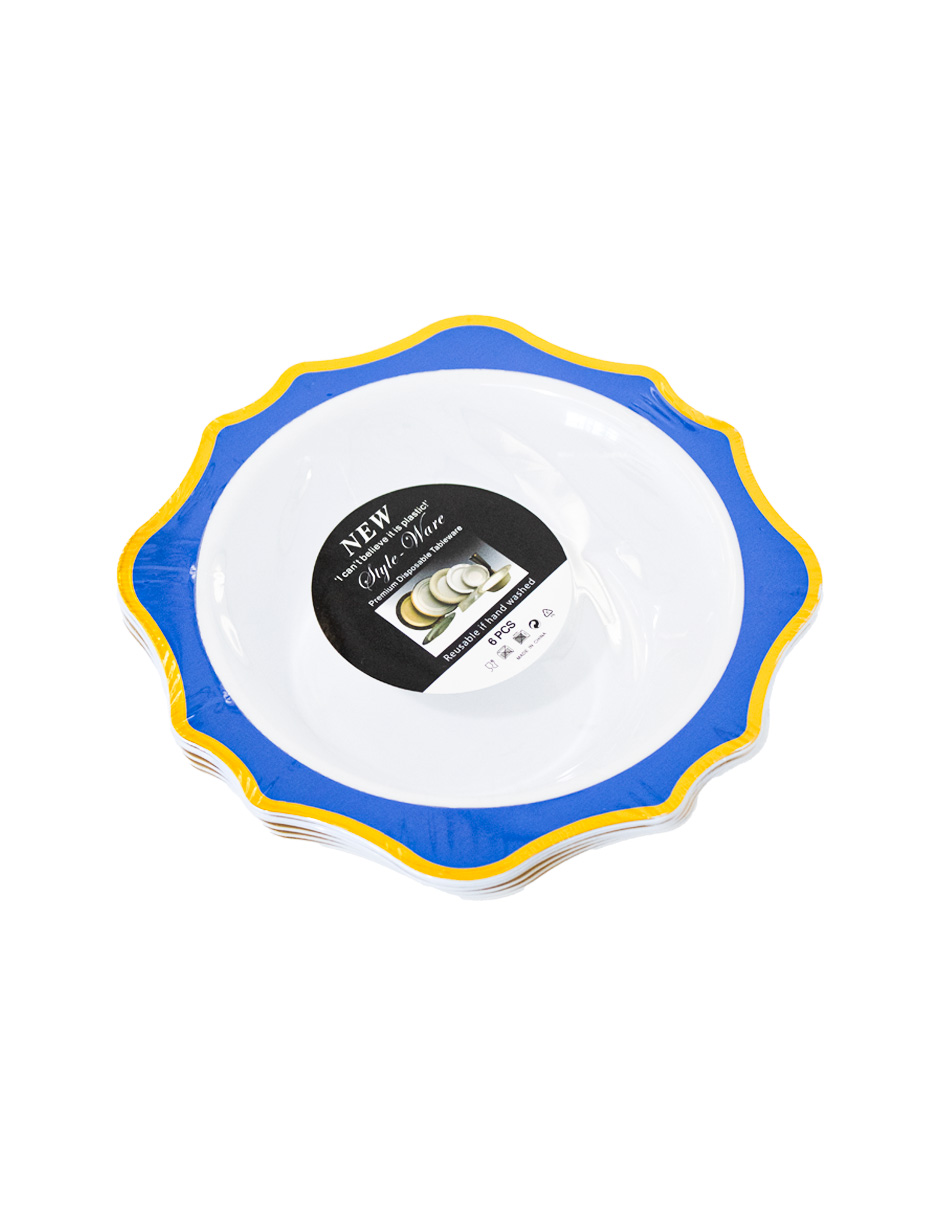 Set de 6 bowls con la sofisticada orilla ondulada, el borde azul y el filo dorado. Perfectos para guarniciones o postres en mesas que buscan un aire de elegancia clásica. El material es plástico. Medidas: 17 cm de diámetro.