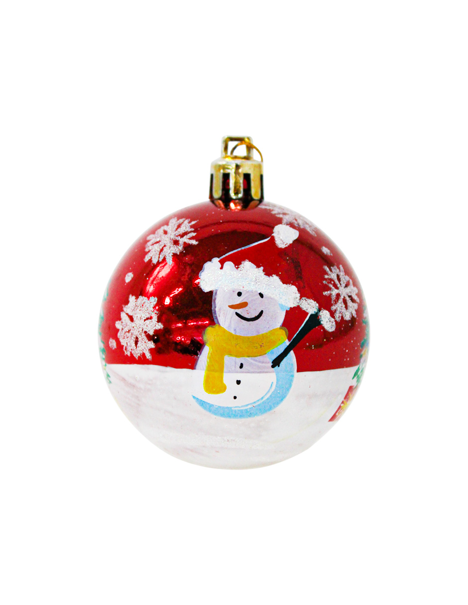 Set de 8 esferas que captura la inocencia y la alegría de la temporada invernal con su encantador diseño de muñeco de nieve. El vibrante rojo mate de la esfera sirve de fondo perfecto, inyectando un espíritu festivo, tierno y acogedor a tu decoración. Fabricadas en plástico con acabado mate y diseño estampado. Medidas: 6 cm (diámetro).