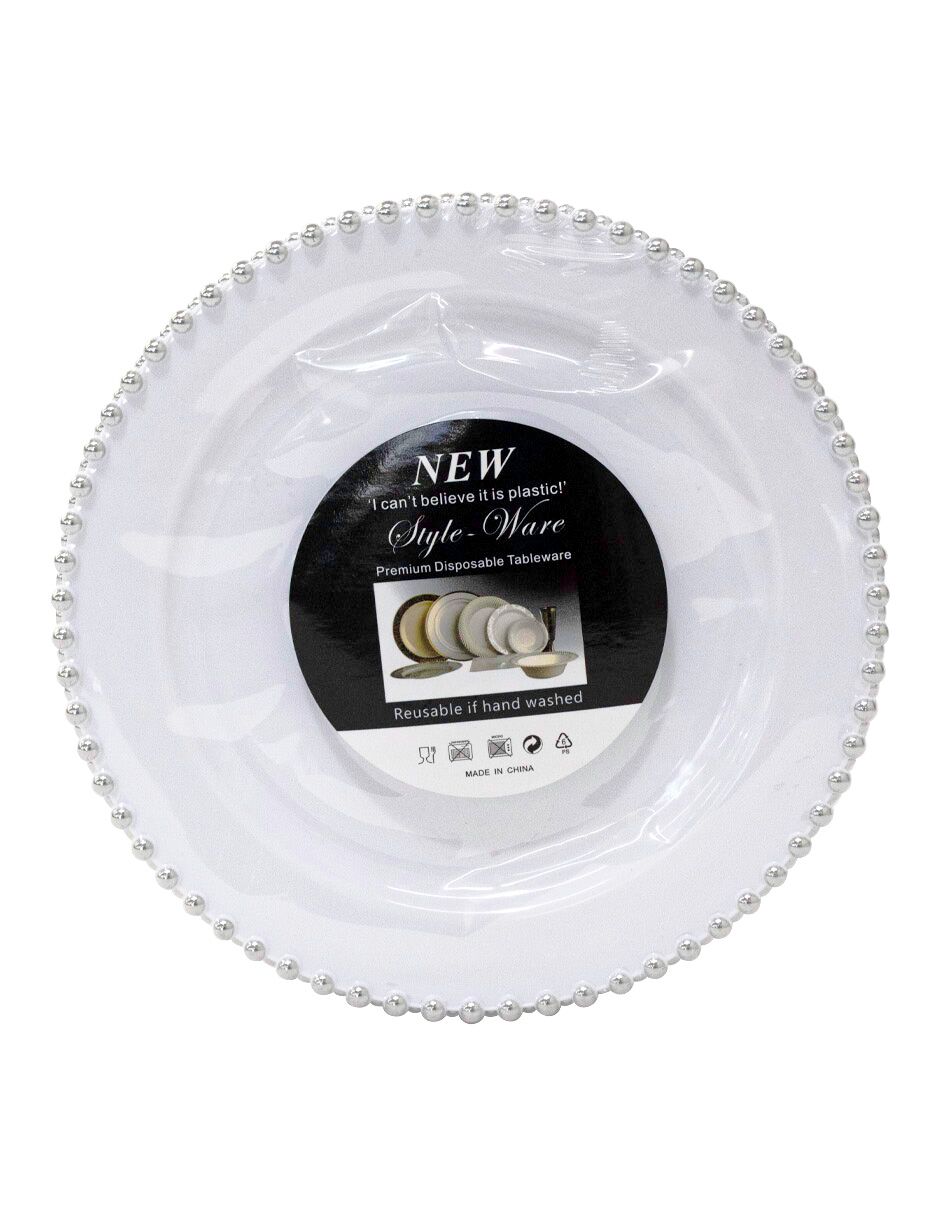 Set de 6 platos pequeños de color blanco con un sofisticado borde de bolitas plateadas. Ideales para servir aperitivos y postres con un toque de refinamiento. El material es plástico resistente. Medidas: 17 cm de diámetro.