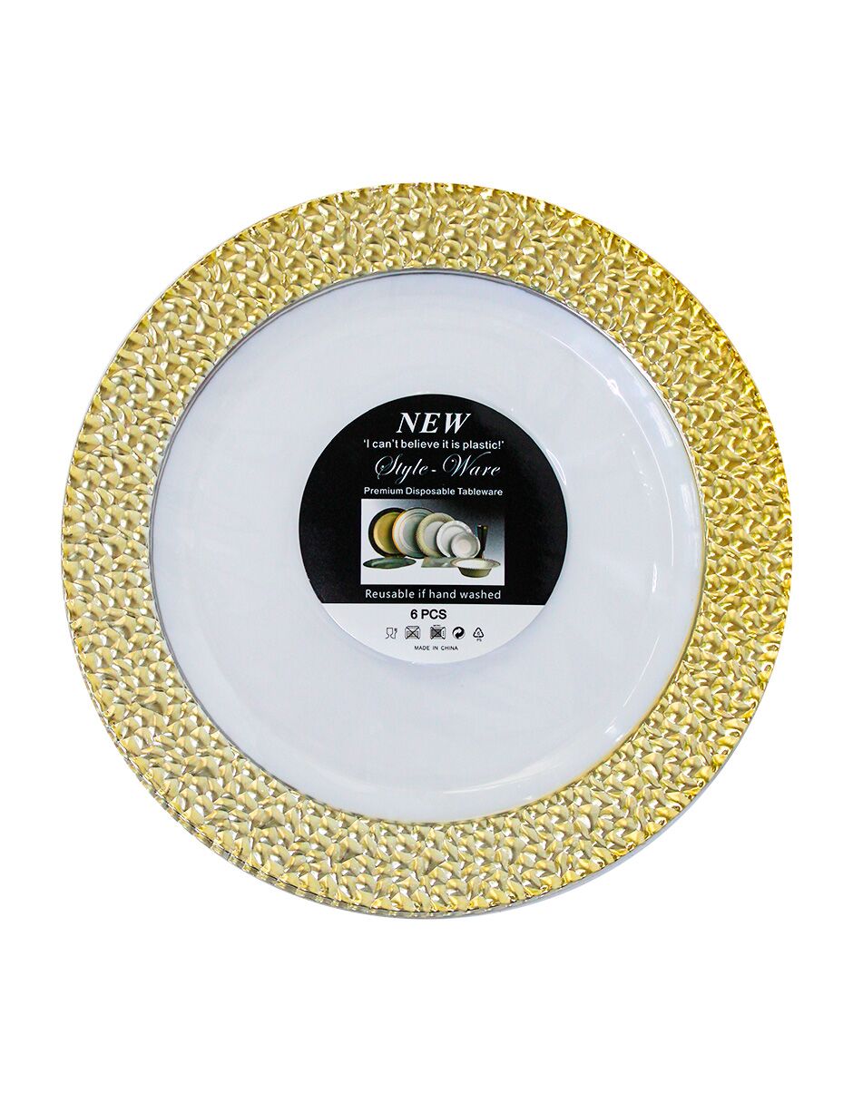 Set de 6 platos para postre o aperitivo. Fabricados en plástico resistente con un espectacular borde decorativo en tono dorado brillante. El material es plástico. Medidas: 18 cm de diámetro.