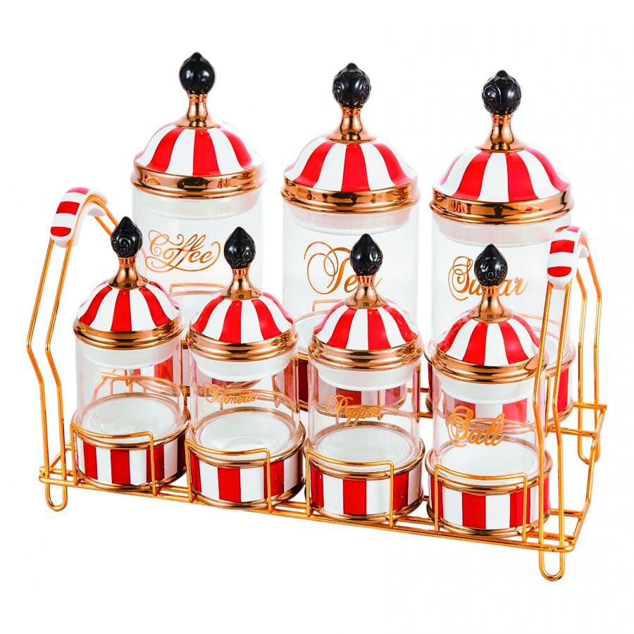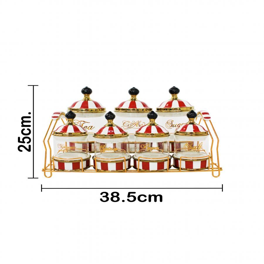 Set de 7 especieros fabricados en vidrio con porcelana en un diseño de puntos tipo caramelo. Presentados en una lujosa charola dorada. El material es vidrio, porcelana y metal. Medidas: Charola 11 x 11 x 16; Especiero 8.5 x 8.5 x 11.5 cm.