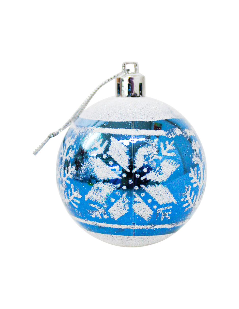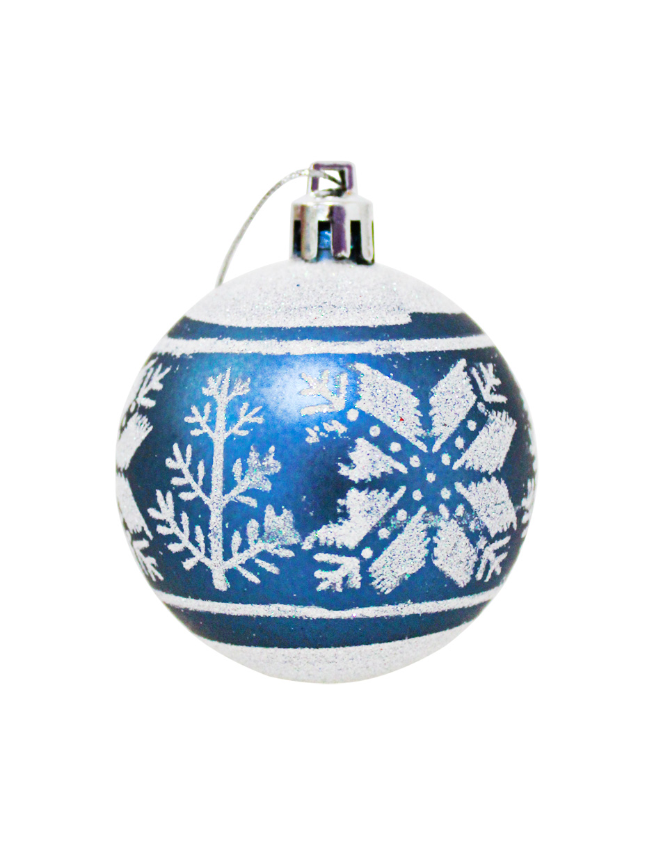Caja con 8 esferas en color azul con un elegante diseño de nochebuena blanca. Ideal para un estilo invernal, sutil y elegante.