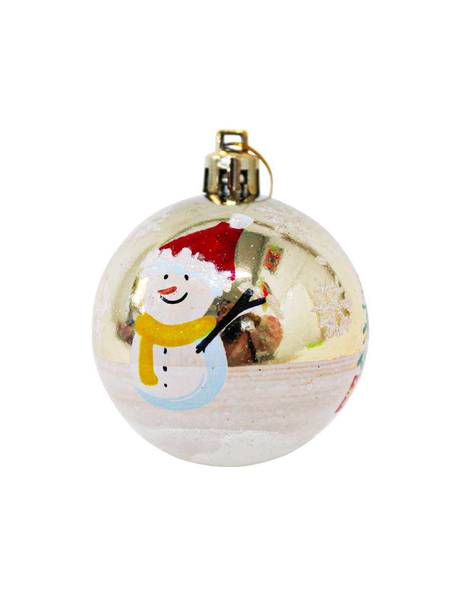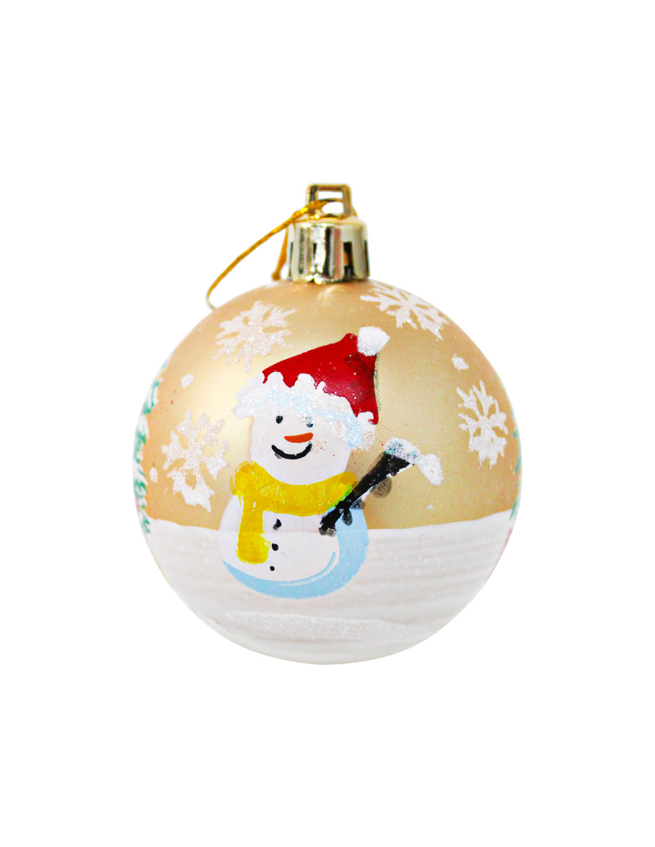 Set de 8 esferas que combina el lujo clásico con la ternura invernal en un diseño irresistible. El brillante color dorado de la esfera irradia opulencia y sofisticación, mientras que el encantador muñeco de nieve añade el toque tierno y festivo. Fabricadas en plástico, son seguras, livianas y resistentes. Medidas: 6 cm (diámetro).