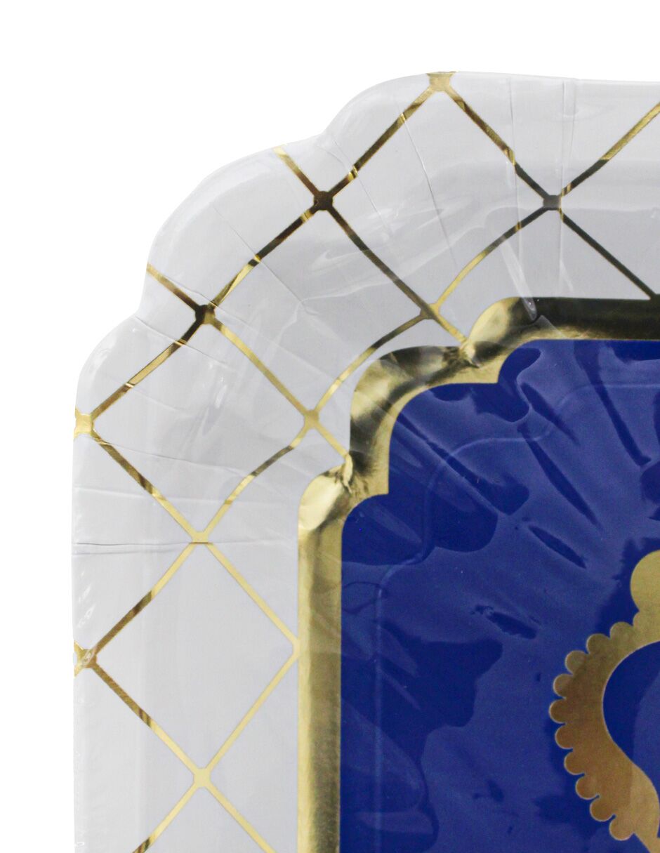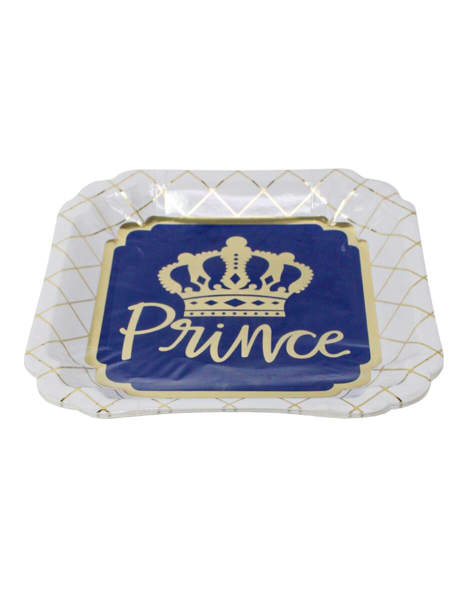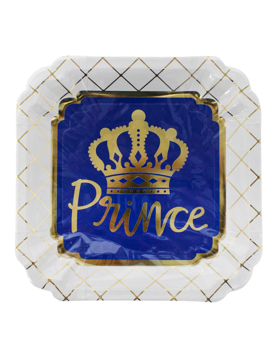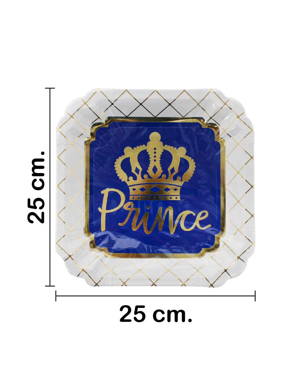Paquete de 8 platos cuadrados grandes con un regio diseño de corona dorada. Perfectos para bodas, quinceañeras o cualquier evento de gran lujo. El material es papel. Medidas: 24.6 x 24.6 x 1.5 cm.