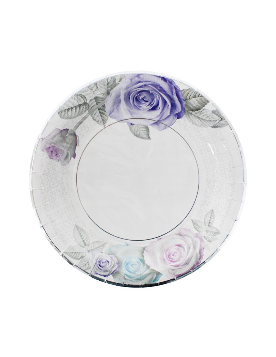 Paquete de 8 platos medianos de papel blanco con un elegante estampado de flores moradas. Aporta sofisticación a cualquier evento. El material es papel. Medidas: 22.5 x 22.5 x 2.5 cm.