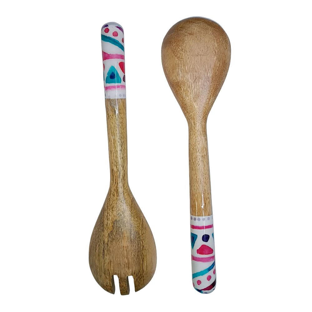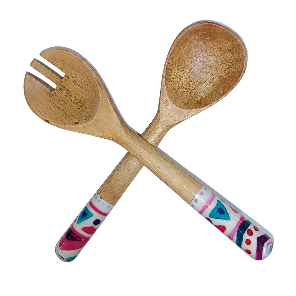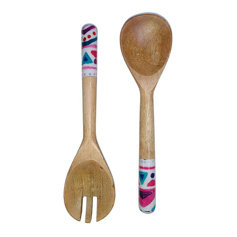 Set de cucharones de servir con un llamativo estampado de rombos y líneas moradas y rosas. Un diseño lleno de personalidad para tus utensilios. El material es madera. Medidas: 27.5 x 7 x 3 cm.