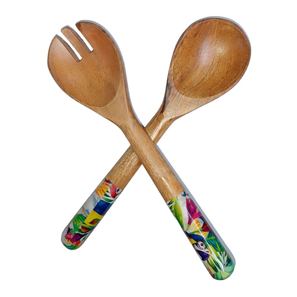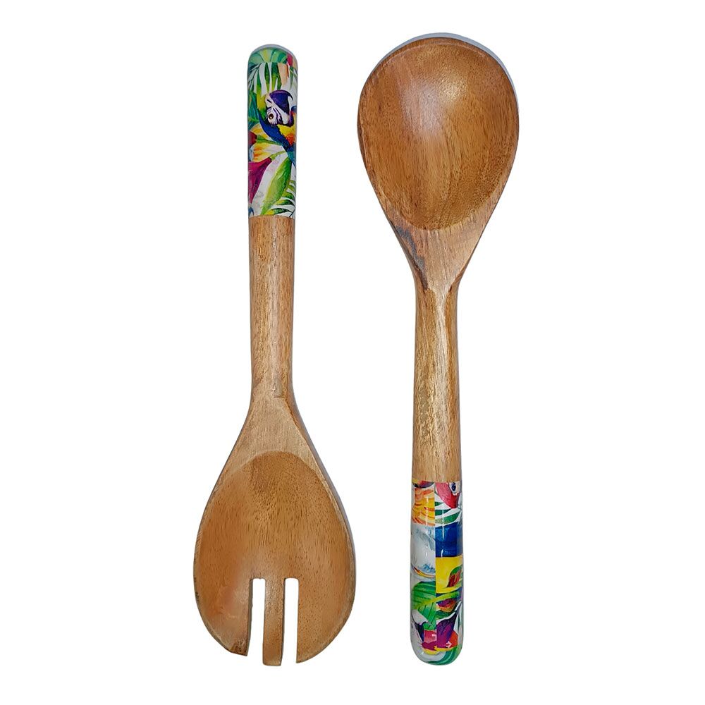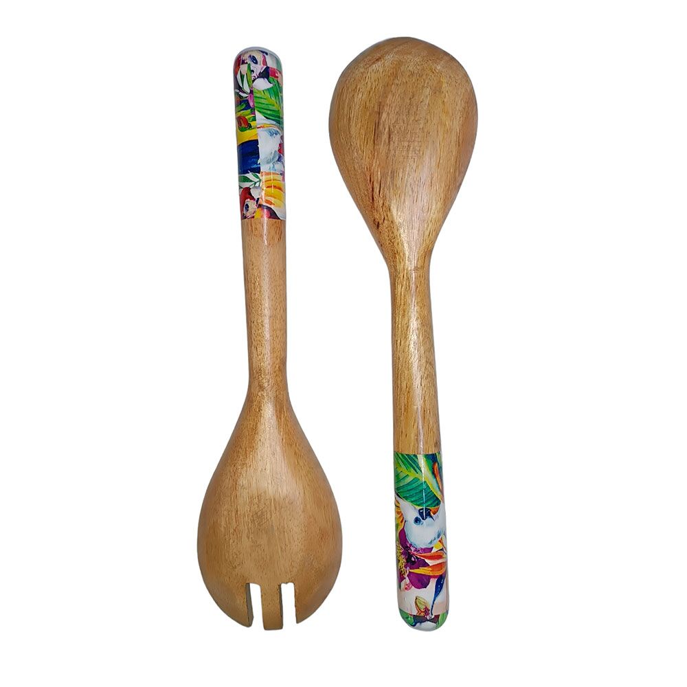 Set de cucharones de servir con un exótico estampado de tucanes y guacamayas. Ideal para fiestas temáticas tropicales o veraniegas. El material es madera. Medidas: 27.5 x 7 x 3 cm.