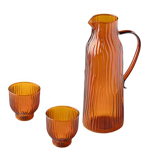 Set de jarra con 2 vasos a juego. Las piezas están fabricadas en vidrio ámbar ranurado que aporta una textura y color vintage. El material es vidrio. Capacidad: 240 ml (vasos).