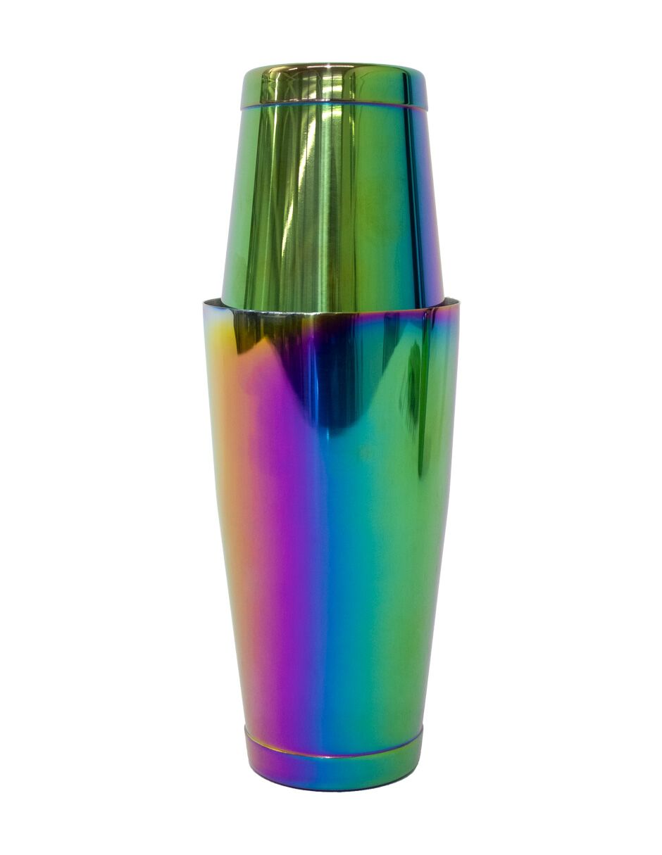 Shaker (coctelera) de dos piezas con capacidad de 500 ml. Su diseño sin fugas está reforzado por su construcción en acero inoxidable con llamativo acabado multicolor iridiscente. Perfecto para mezclar con técnica. Medidas: 9.2 x 9.2 x 17.5 cm.