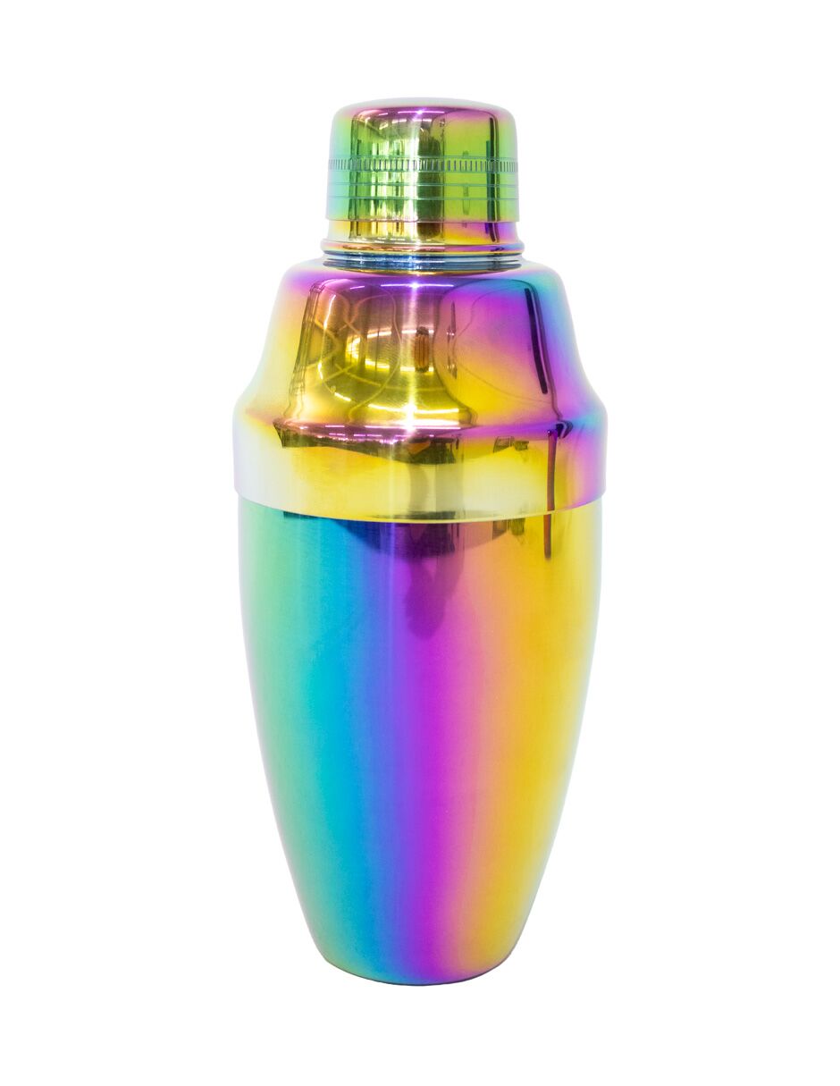 Shaker cobbler (tres piezas) de 500 ml con un deslumbrante acabado multicolor iridiscente. Su construcción en acero inoxidable asegura un enfriamiento óptimo y un mezclado sin fugas. Perfecto para bebidas individuales. Medidas: 8.5 x 8.5 x 19.5 cm.