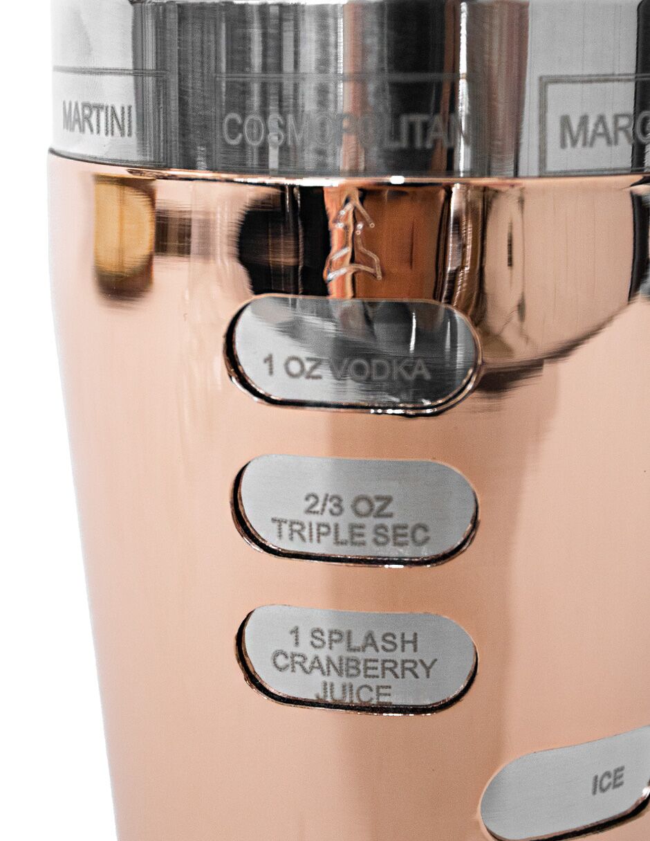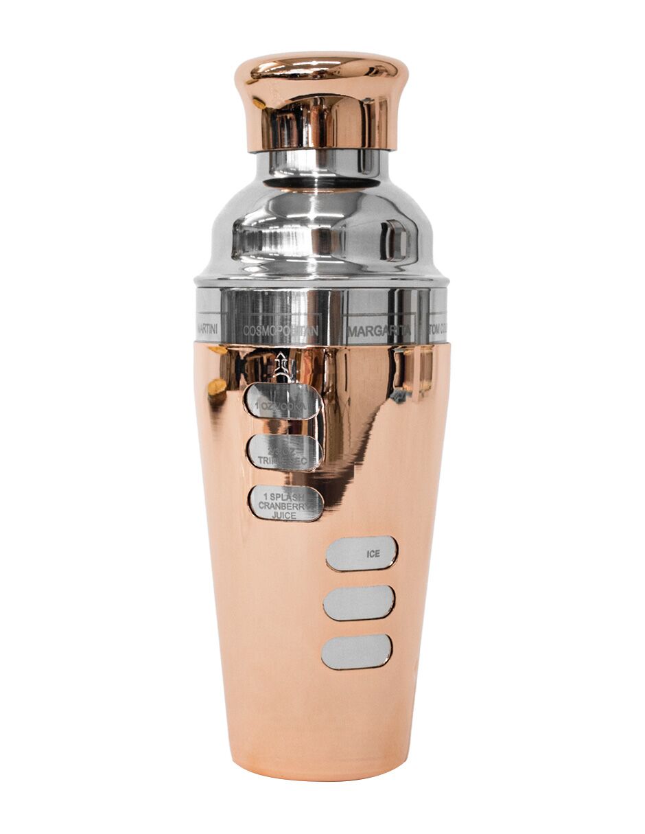 Shaker Boston (coctelera) de alta gama con un llamativo acabado color cobre pulido. Fabricado en metal de alta calidad para un sellado perfecto y un enfriamiento rápido. Su estética lo convierte en una pieza central del bar. El material es metal. Medidas: 25 x 9 cm.
