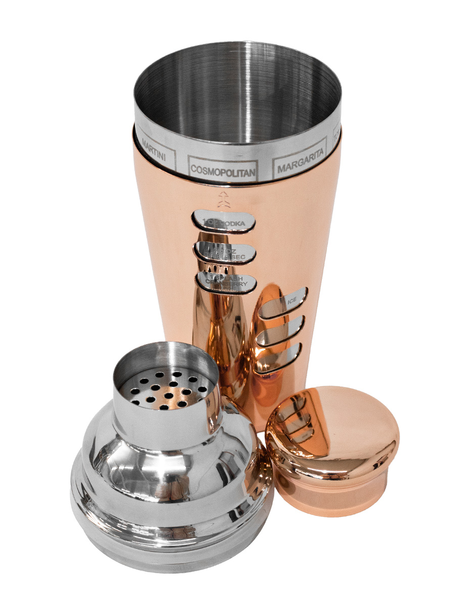 Shaker Boston (coctelera) de alta gama con un llamativo acabado color cobre pulido. Fabricado en metal de alta calidad para un sellado perfecto y un enfriamiento rápido. Su estética lo convierte en una pieza central del bar. El material es metal. Medidas: 25 x 9 cm.